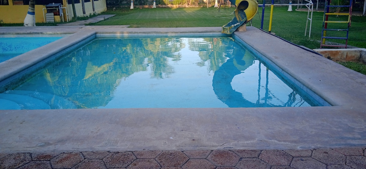 A space to rest with all the comforts: Air Conditioning, Satellite TV, Pool, Cold and Hot Water, Grill, Ping Pong Table, Wifi. Give yourself the rest you deserve just 15 minutes from the center of the City of Campeche by car. We have a single bed, a double bed, a double sofa bed, space for hammocks, inflatable mattresses.