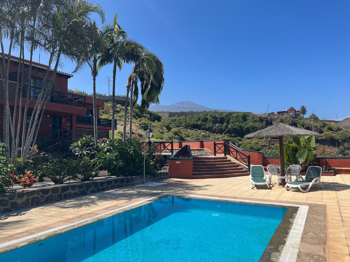 Quiet independent villa, located on a farm with an avocado plantation and spectacular views of the sea, gardens, north of the island and Teide volcano in the background. Fully equipped and with all services nearby (supermarkets, restaurants, bakeries, local market...). High-speed internet, heating and parking for several vehicles.