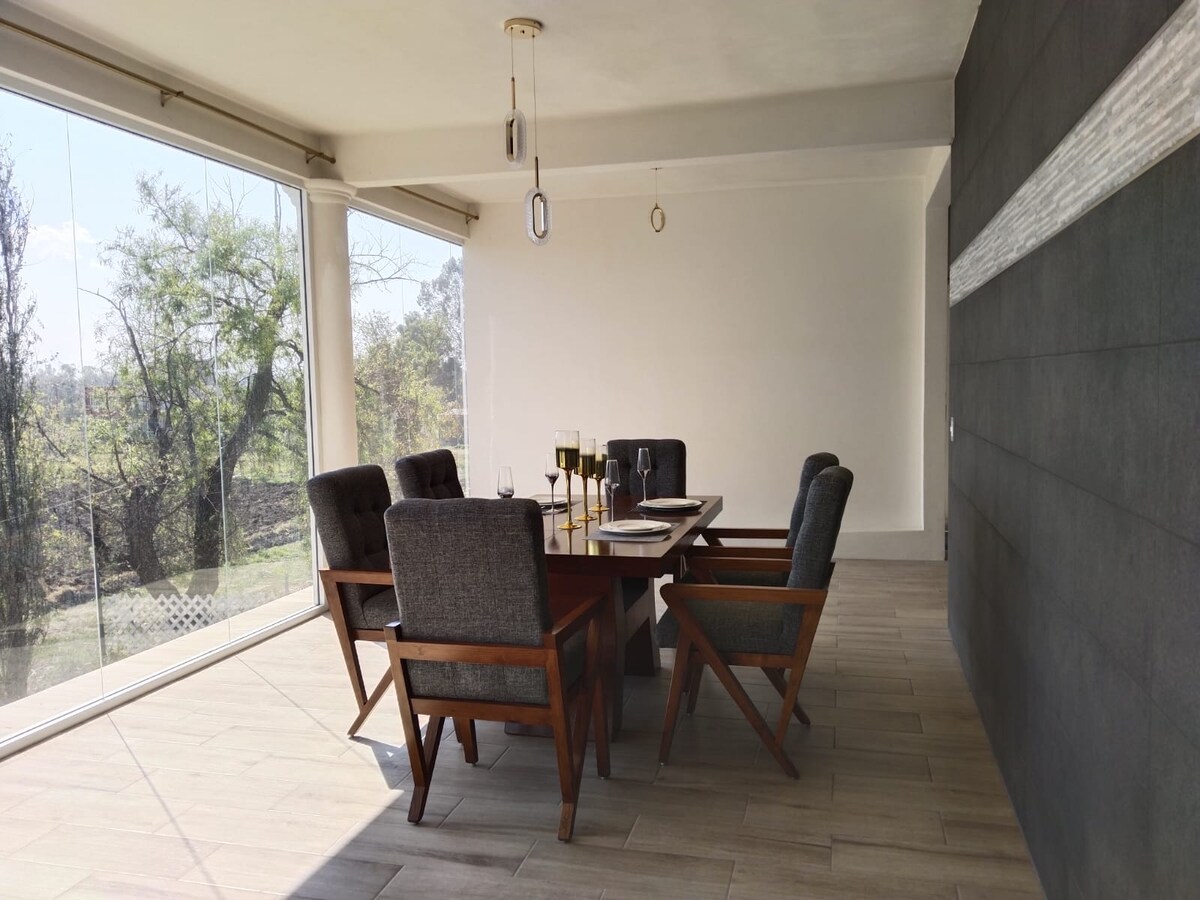 Cozy forest SUITE, views of nature, volcanoes, city, sky. Mountain magic. Chimney. Relax and enjoy in a safe environment, 1100m over Mexico City. 40 minutes from Interlomas and Toluca. Ideal for a love, family or friend’s getaway. Get inspired, hike, homework, or acclimatize to the altitude for a competition. Sunny hillside. Country houses area with surveillance, near new highway. Living room, fireplace, dining room, kitchenette, 2 bedrooms, 2 bathrooms, hot water, grill, screen, Wi-fi.