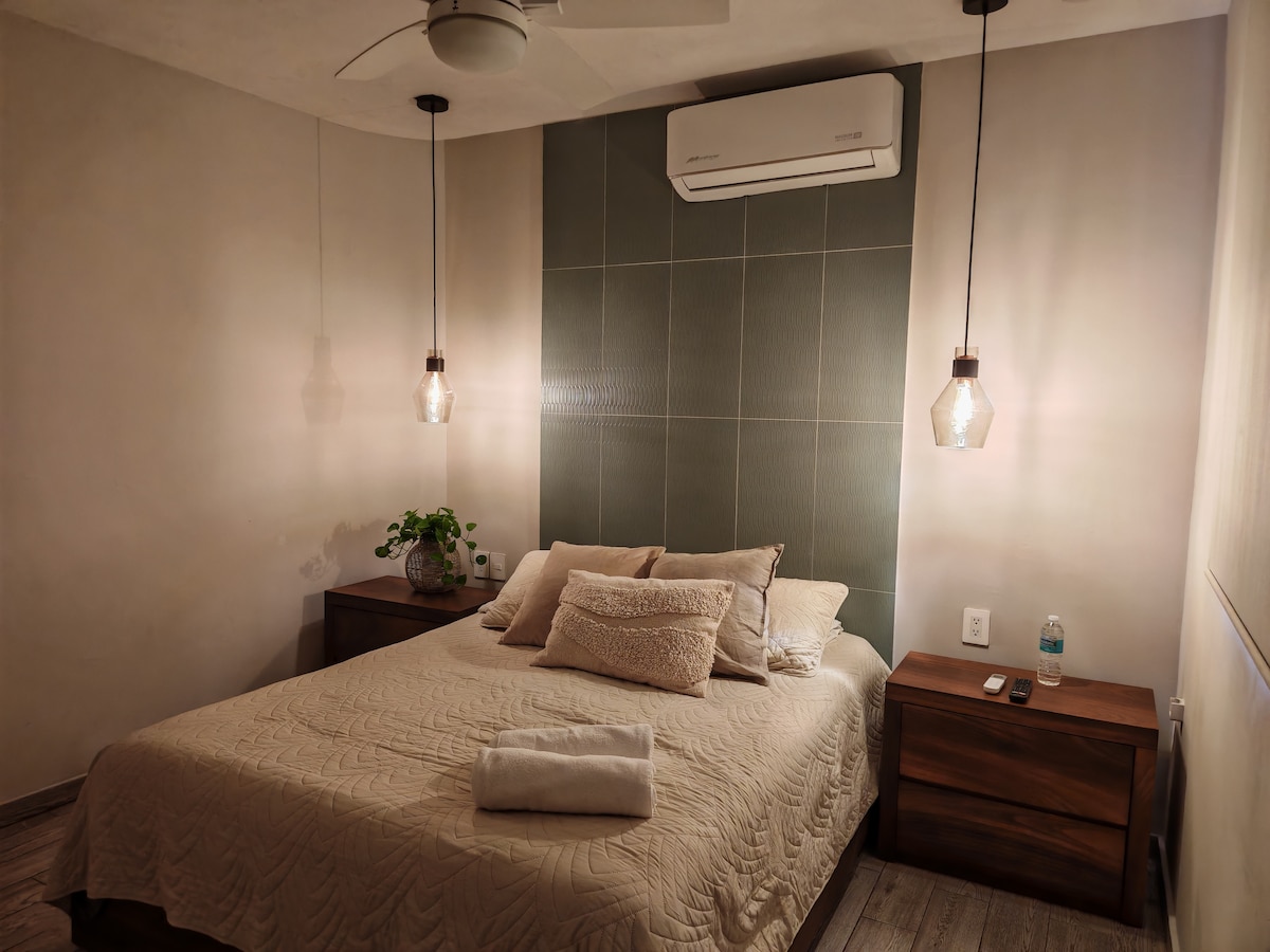 Private and comfortable room in DOWNTOWN TEQUILA. It has a queen bed, private bathroom, air conditioning and a screen with Netflix. Space of 6 private rooms, without shared areas. Ideal for getting around on foot or by car, close to bars, restaurants and main attractions. Includes secure parking 550 meters away, at no additional cost. Arrival instructions sent in advance.