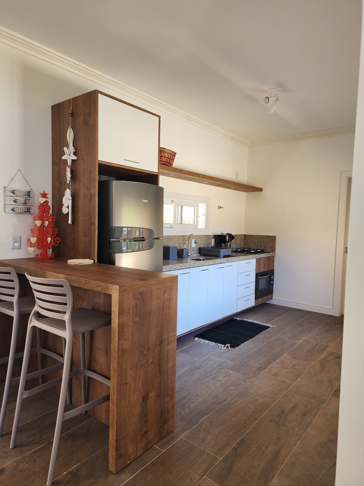 Excellent house for you and your family to enjoy! In addition to the house being super cozy, the condominium is complete. The kitchen is equipped with a refrigerator, cooktop stove, microwave, electric oven, water filter, brewer, dishes, cutlery, glasses, pots, Italian coffee maker, electric jug, etc. Two of the bedrooms have a queen-size bed and the other two have a single bed.