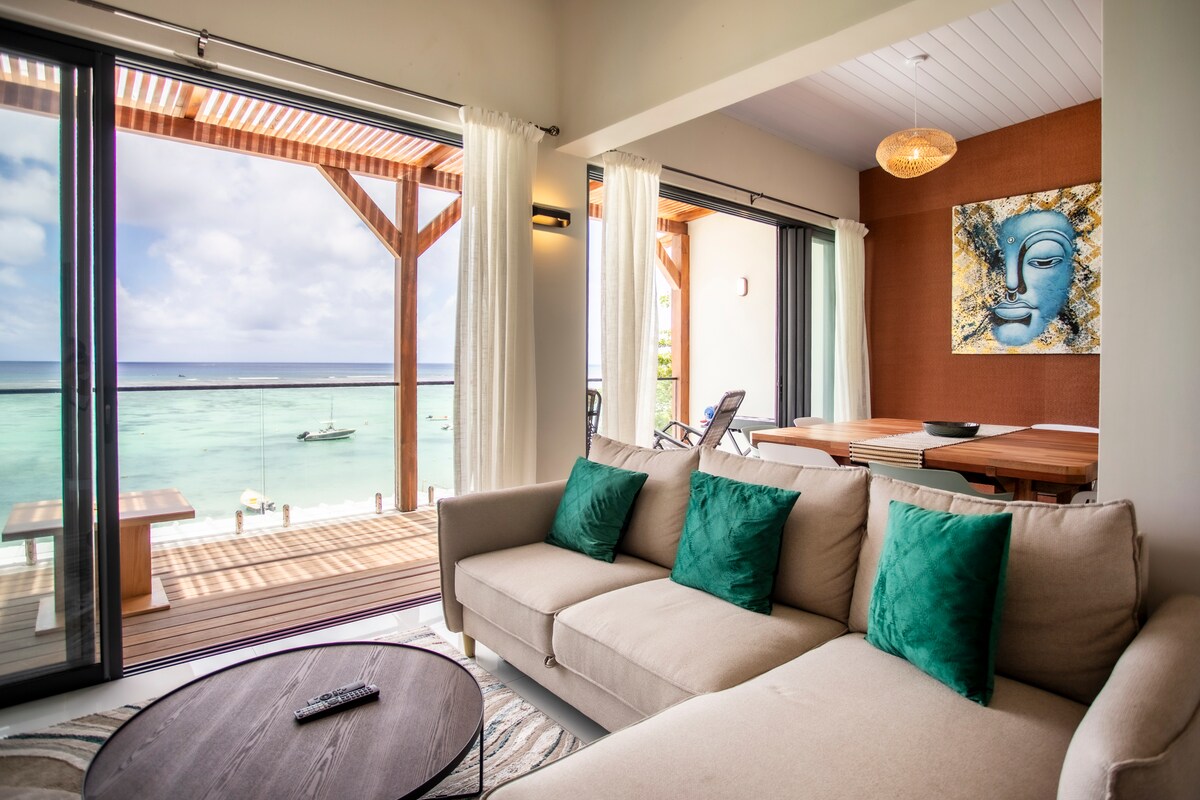 Luxury Beachfront Apartment with Unmatched Ocean Views. Wake up to breathtaking, uninterrupted ocean views. This 5-star beachfront apartment offers the perfect blend of comfort, privacy, and effortless coastal living. Set on the ground floor, the villa opens onto a spacious terrace, seamlessly connecting indoor and outdoor living. Just steps away, enjoy a sparkling pool overlooking the beach. The apartment features a modern open-plan living space all over looking the ocean.