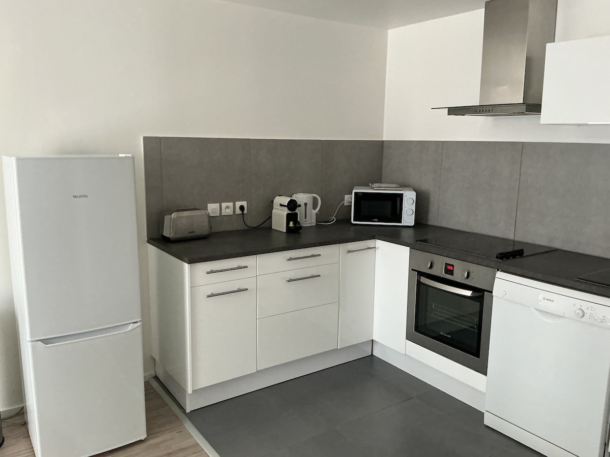 Hi. I offer you a beautiful apartment completely renovated, fully equipped. It is located 15 min on foot from the train station. Free parking spots nearby. During your stay, you can enjoy a fully equipped kitchen, bathroom with shower, washing machine and ironing facilities, quality bedding with memory foam mattress but also a Smart TV and internet connection.