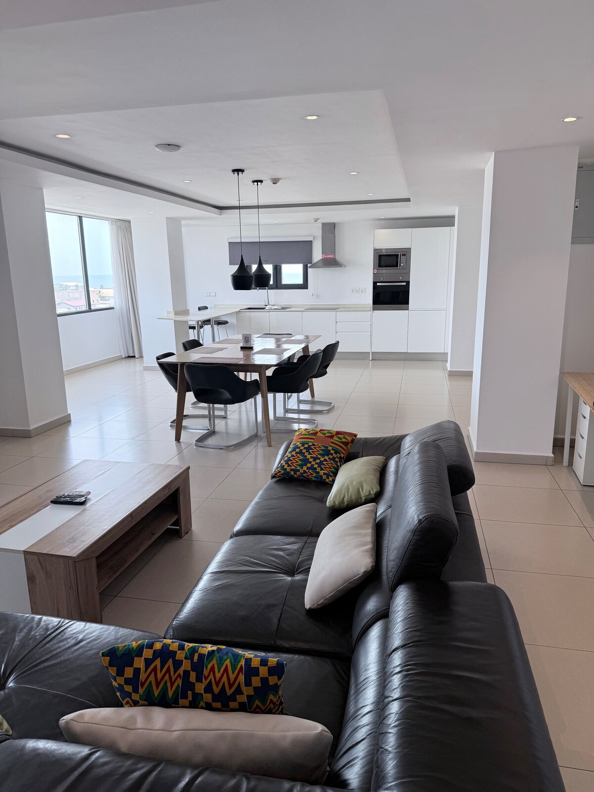 Wake up to one of Accra’s best sea views in this luxury 3-bedroom penthouse. Ride your private elevator straight into the apartment, step onto the wraparound balcony, or step outside to the rooftop infinity pool, bar and restaurant. Perfect for groups, families and work trips, the space features hotel-style beds, a fully equipped kitchen, fast Wi-Fi + dedicated workspace, in-unit washer/dryer rack and 24/7 security, all in a central location close to Osu, beaches and nightlife.
