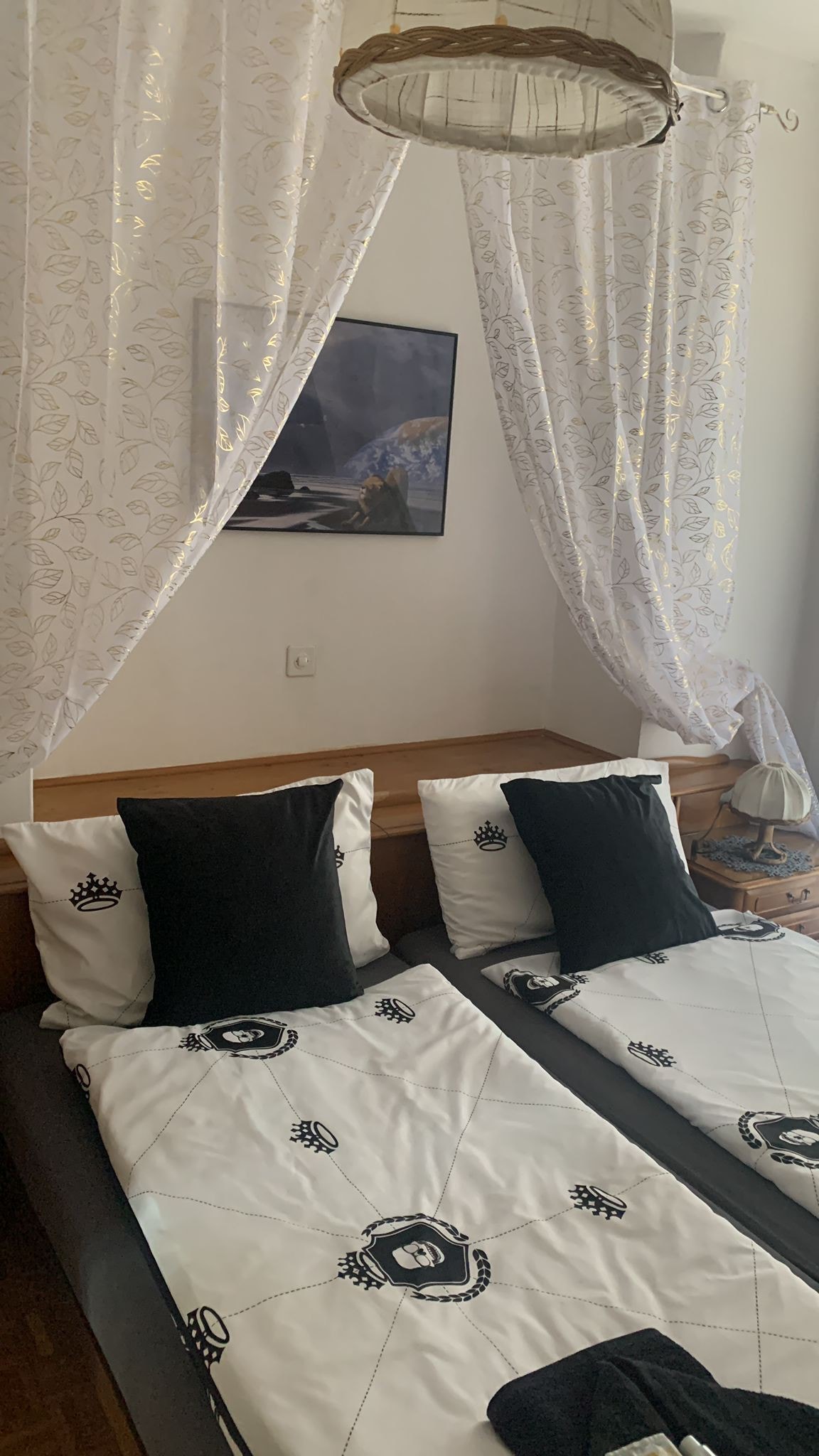 Ciao Sit back and relax - in this quiet, stylish accommodation right next to the forest. Beautiful old renovated rustico from 1900 with large open-plan living room/bedroom with balcony and large covered terrace with outdoor kitchen and lounge sofa. Large garden with mature trees.