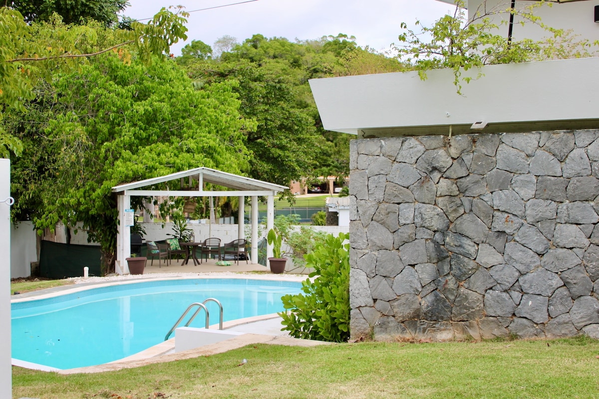 Your own private hill with spectacular mountain views, large patio and outdoor environment. Enjoy eating and drinking at a unique kitchen and bar surrounded with a beautiful terrace and views to enjoy family gatherings. Plunge to a unique/small pool and creat great vibes, perfect for many photo memories. Great for walking-cardio inside property. Get ready for a authentic and relaxing Puerto Rico experience.