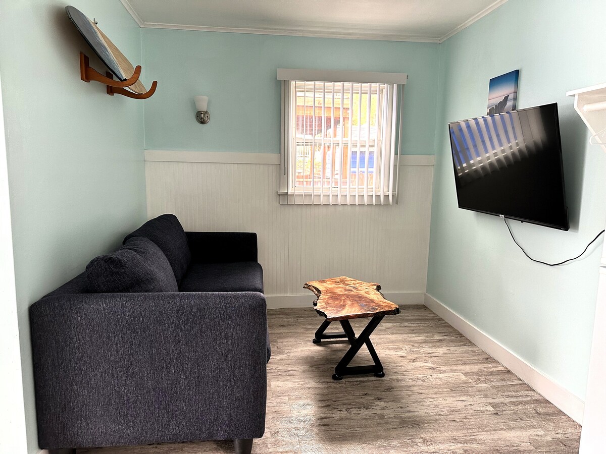 Beach Stay Unit #3 is a comfortable quiet one room plus bath unit decorated with a Flintstone theme & a grass wall. The unit features a king size bed, a TV and an area for making light meals and morning coffee. There is a mini refrigerator, a microwave, and both a small drip coffee pot and a Keurig coffee maker.The bath is small but adequate with a shower stall. The unit is at the rear of the property and features a deck with four steps up to the front door.