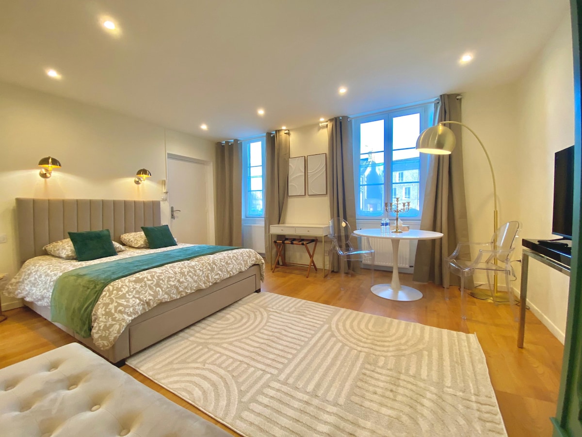 Welcome to L'Escale Cherbourgeoise! Bohemian atmosphere for this charming and cozy 40 m² apartment, ideally located in the hyper center. Completely renovated and newly equipped, it is perfect for 4 to 6 people. Close to the port, town hall and all shops. 15 min walk to the train station and the Cité de la Mer, 10 min to Naval Group and DCNS Street parking is free. Free port parking 200 m away. 24/7 check-in/checkout