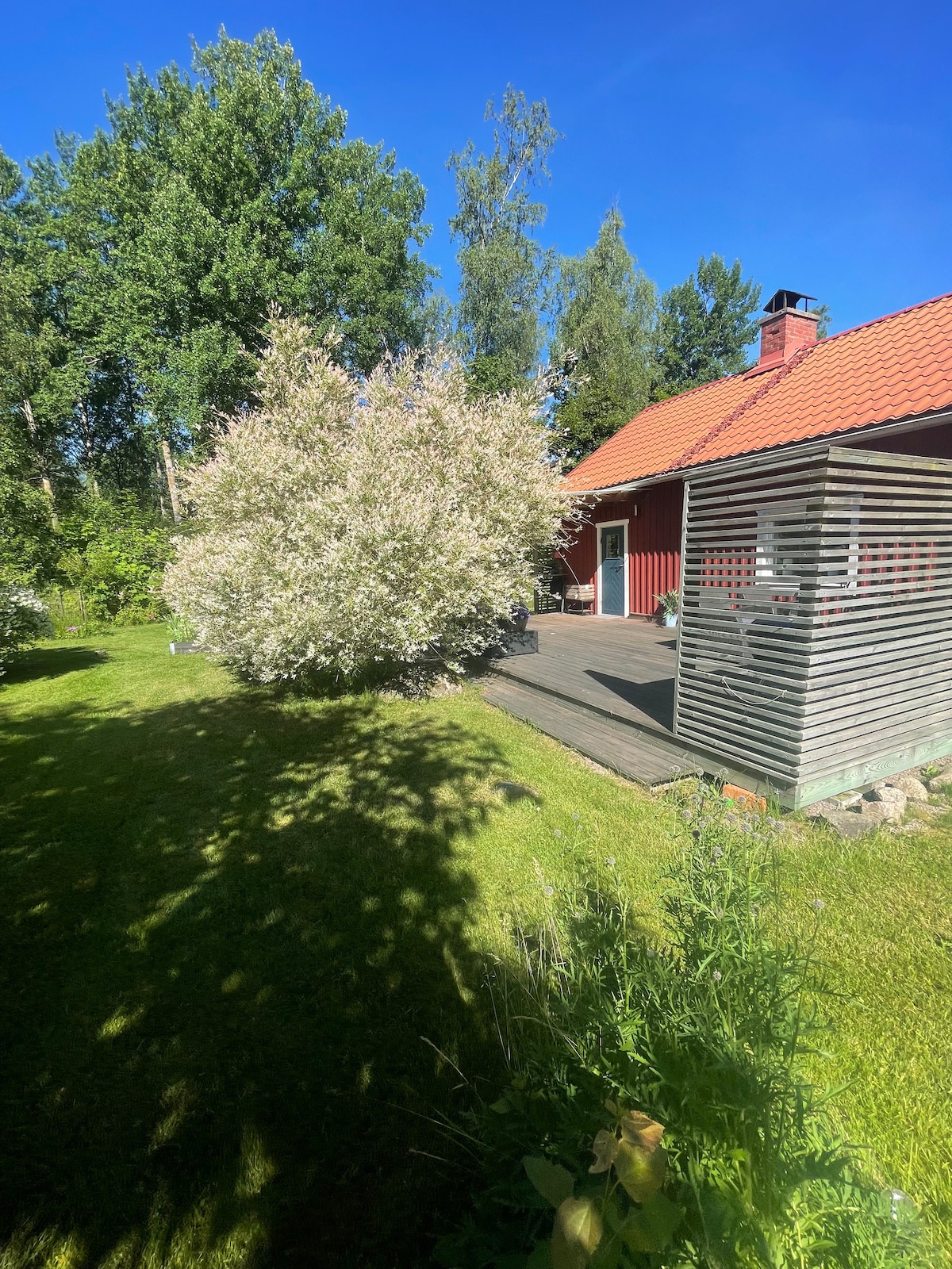 Take it easy at this unique and tranquil getaway. The cottage is in the forest edge. Located between two lakes, Vänern and Skagern. Close to golf course. 40 minutes from Tiveden National Park. 15 minutes to Sjötorp with Göta Canal. 10 minutes to grocery store. Fully equipped kitchen with fridge and freezer in a building next door. There is also a shower and toilet that is shared with another person.