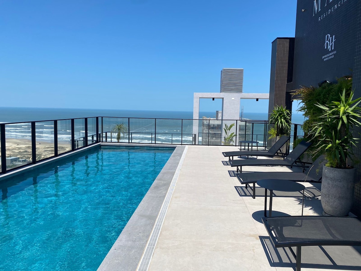 Enjoy an unforgettable vacation just 300 m from the beach! Modern, cozy and practical flat. Close to markets, restaurants and movie theaters. Equipped with a double bed, sofa bed, extra mattress, air conditioning, smart TV, Wi-Fi, washing machine and barbecue grill. Enjoy the rooftop pool and gym. Includes bed linens, towels and pillows. Ideal for couples, families or groups.