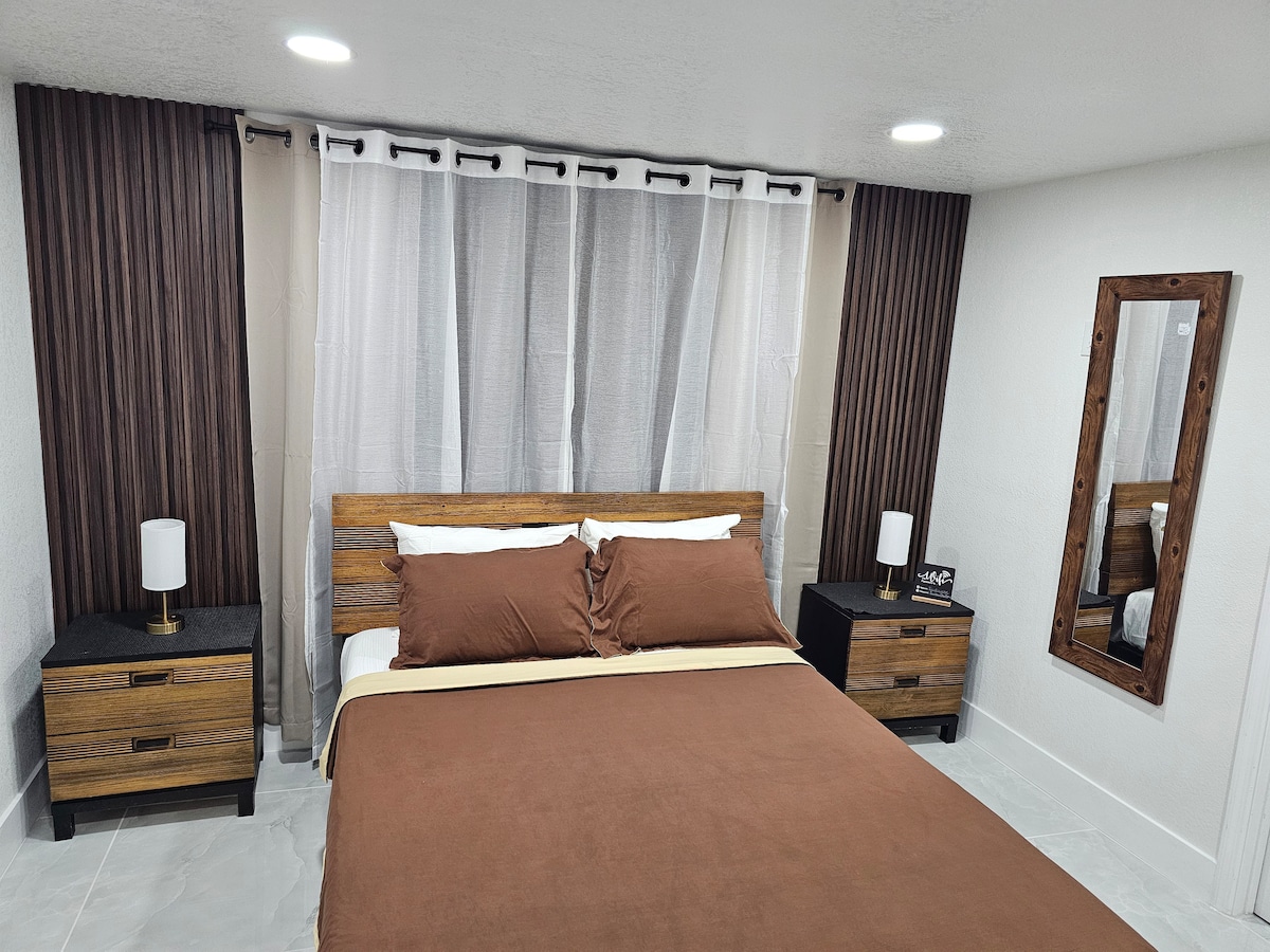 Private apartment with full bathroom, kitchen with a small electric stove and a full size fridge, living room, dining room, a king size bed with a night stand, tv with wifi, independent entrance and parking excellent neighborhood very safe. note: there are no windows it makes the place more quiet to get a good night sleep.
