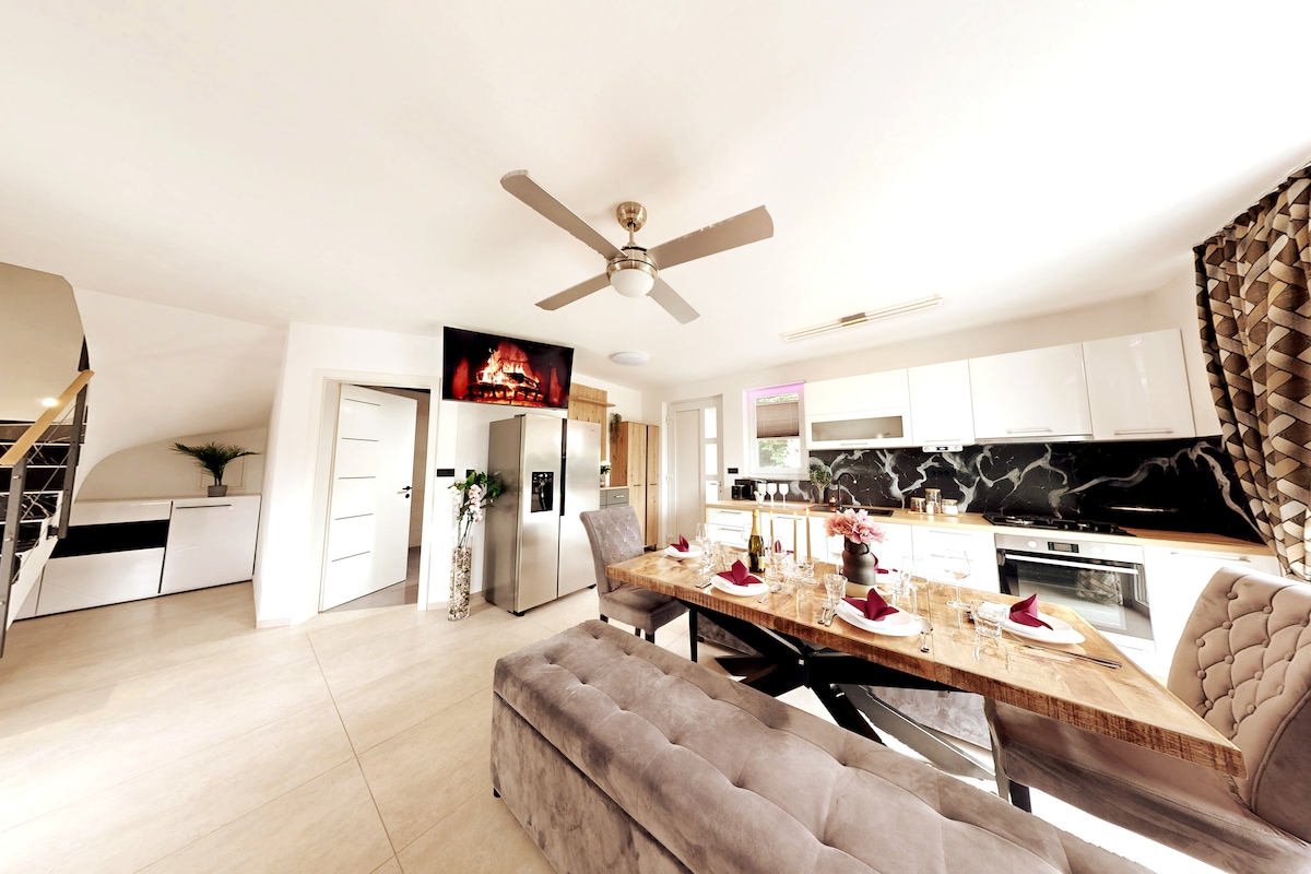 Idyllic apartment in Lower Carniola, with fabulous and unique views. Optimally suitable for individual tourists, athletes, motorcyclists, business travelers and people which love pure nature very much. Dolenjska's best kept secret for the alternative travel with high standard, close two capitals and an indescribable atmosphere. Welcome to the Villa Katarina. Anton&Michael INFO: kitchen and bathroom are in 120m2 apartment and in great condition.