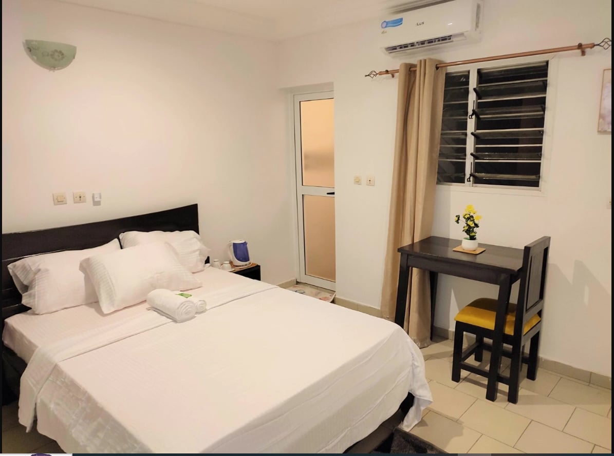 Beautiful villa with equipped kitchen, full bathroom, office, wifi, air-conditionning, TV, in a green and peaceful property, with swimming pool in Abidjan, Riviera 3. Booking includes free weekly cleaning, bedsheets, towels, soap, and free laundry and ironing of guests' clothes. The pool and garden may be shared with other guests. An additional bed is available for a 3rd guest. The property is peaceful and has many trees. It is 10 minute walk from shops and restaurants.