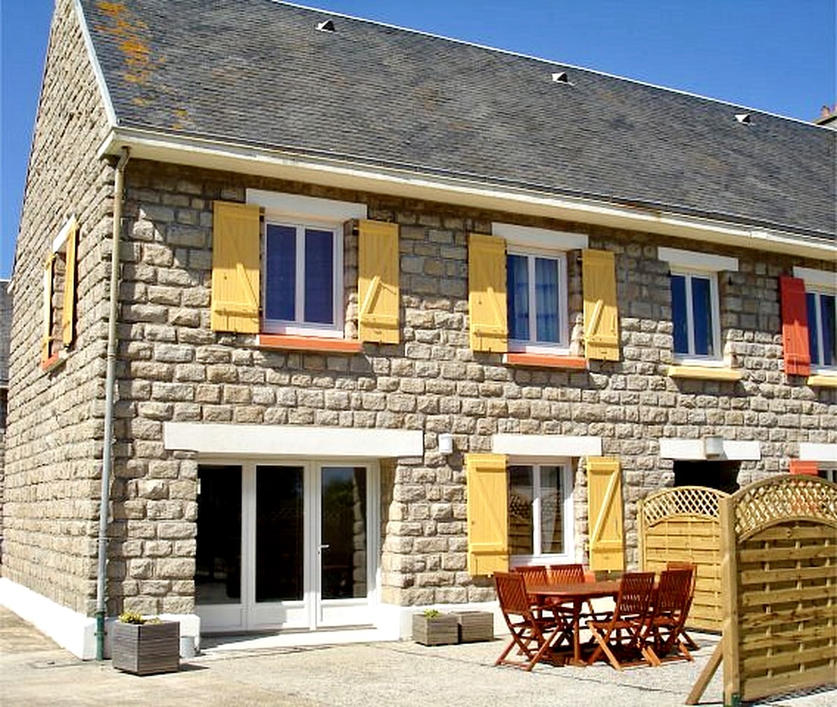27 m2 wooden accommodation. Quiet in residence. Close to beaches (3 km) and shops (400 m). Possibility to walk down to the port by a very pleasant little path along the Steir. Fully-equipped accommodation. Linens provided. Pets are welcome, a fenced garden is at their disposal.