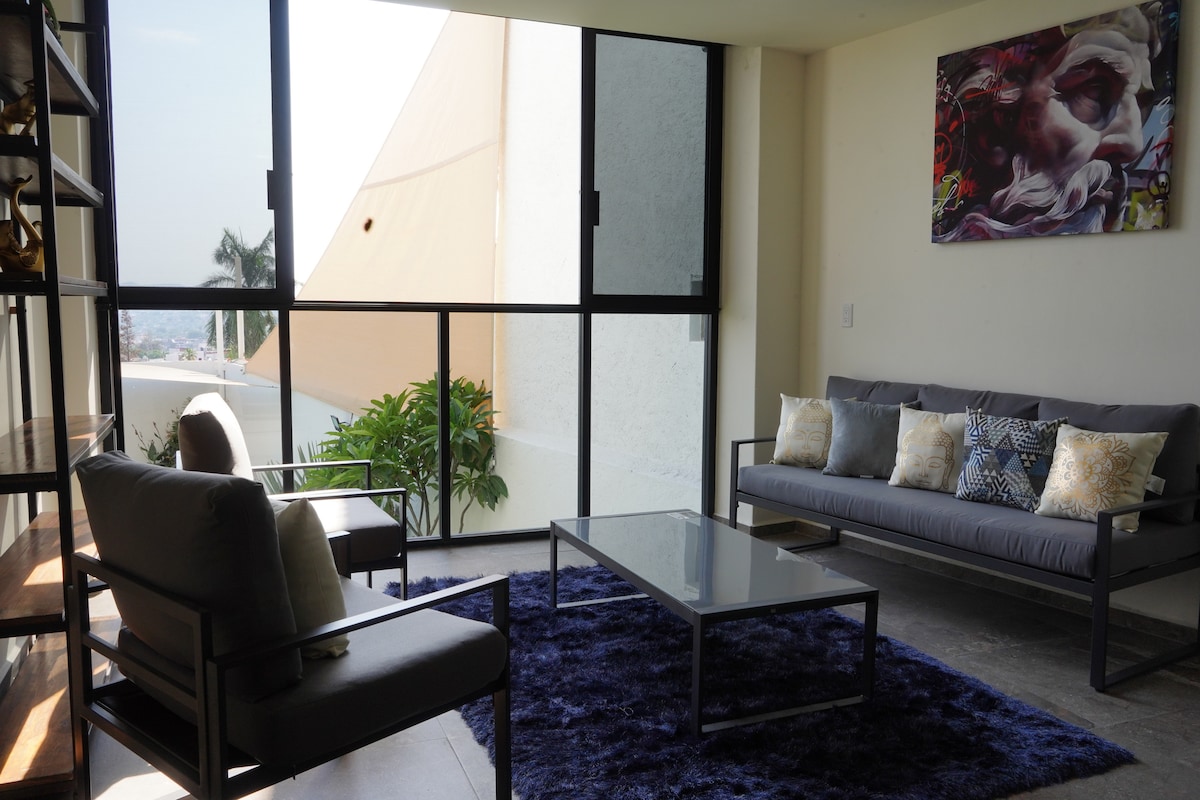 Enjoy the charm of this industrial-vintage apartment with a terrace and jacuzzi with a panoramic view. In it you can see a collection of antique objects. It is located in a residential subdivision with 24-hour surveillance, has a golf clubhouse, 5 minutes from the historic center of Cuernavaca. With easy access to the highway and main avenues of the city.
