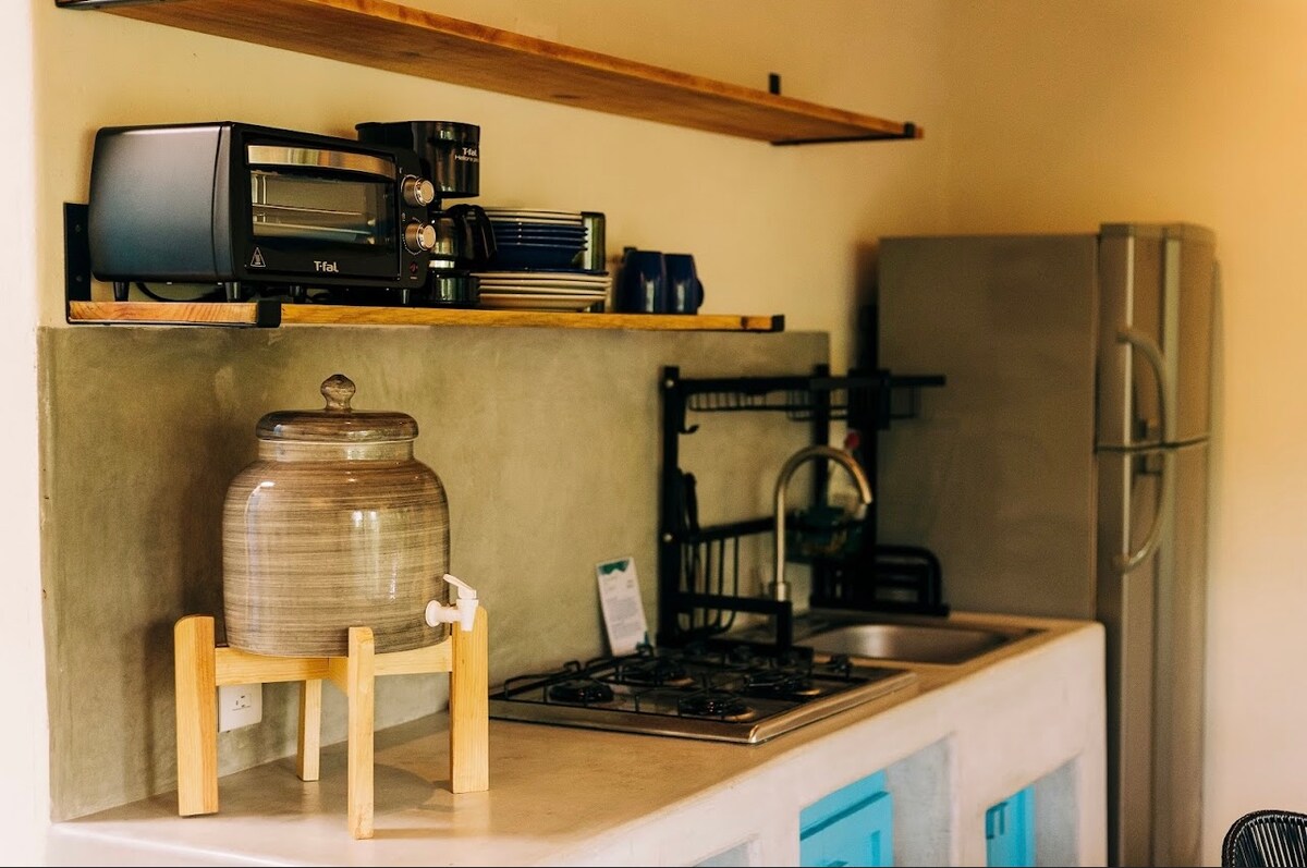 GAIA is one of the three charming bungalows that make up Casa Copal, a small complex designed to give you a unique experience of rest and adventure on the beautiful coast of Troncones. With a privileged location, just three blocks from the beach and next to the hiking and mountain biking trail, this cozy bungalow offers you an exceptional accommodation experience, perfectly blending modern comfort with the rustic charm of Troncones.