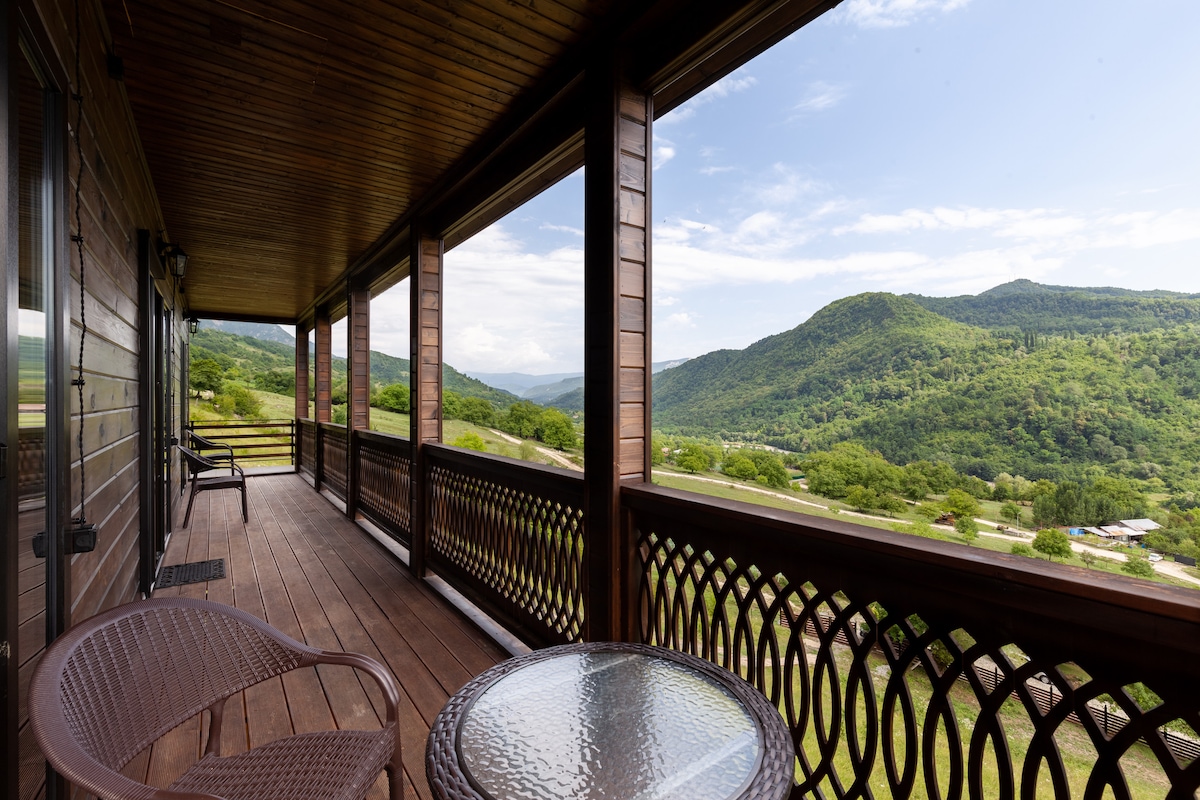 Have a great experience in our wood cabin, with amazing views and peaceful scenery. You can enjoy two comfortable bedrooms, 2 bathrooms and living room with kitchenette with your family or group of friends on the very calm and beautiful hill in Racha. Our place is located near to several small wineries and walking distance to traditional Rachian Restaurant. Please note that cabin is on hill and you will have to walk some stairs.