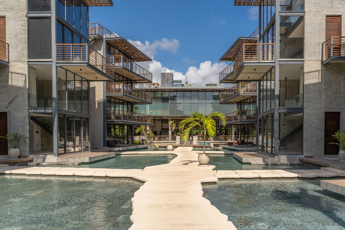 3 Min Walk to Centro Tulum 5 Min Drive to Tulum Beach 5 Min Drive to Tulum Ruins When you stay in this beautifully designed, modern studio located right near Centro Tulum, indoor and outdoor living blend together seamlessly. Modern with fiber WiFi, and open bedroom, a sleek modern kitchen, spacious living areas, and luxurious pools, this quiet retreat is also minutes from the best restaurants and bars. Balcony is next to a serene waterfall. Experience Tulum With Us & Learn More Below!