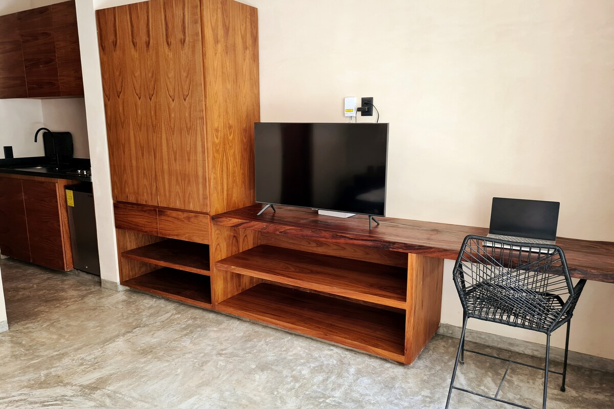 Charm and comfort await you in this modern studio for 4 (2 adults and 2 small children) in Tulum. Ideal for families or friends, it offers an equipped kitchen and a living room with a short sofa bed. Its prime location allows you to easily explore the dreamy beaches and local culture. Enjoy amenities such as Wi-Fi, a cinema, access to 2 refreshing pools and a gym. Live an authentic experience, surrounded by nature, without sacrificing comfort. Your perfect getaway in paradise.