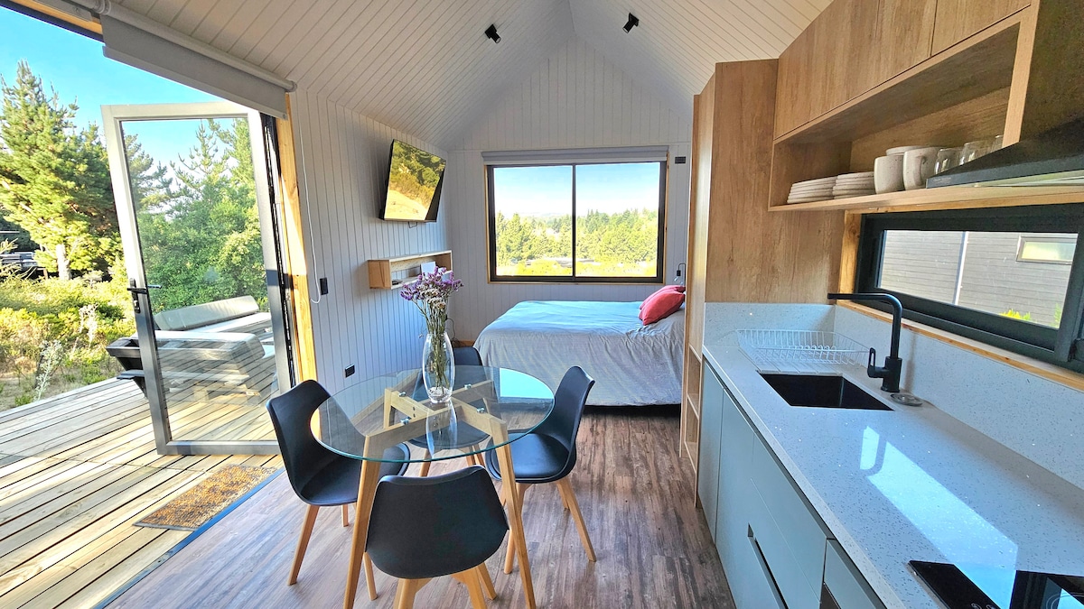 Cozy, uniquely designed double-height (47mt2) refuge. Ideal for escaping the coastal wind characteristic of the area and enjoying temperate valleys, streams, and unspoiled nature. Steps to the beach, restaurants, and supermarkets. HOT TUB service $38,500 for 2-night stays. Distances: - 2 minutes from the supermarket. - 2.5 km from La Vega de Pupuya. - 4 km from Matanzas. - 24 km from Puertecillo. (40 min) - A few meters from Arena Pupuya Padel. On RAINY days, a 4x4 vehicle is required.