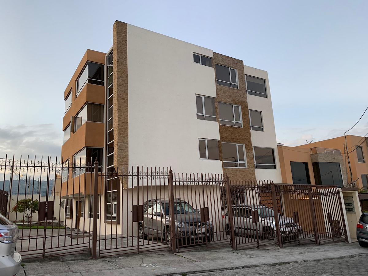 Complete spacious and very bright flat two blocks from Guaytambos Ave. It has two bedrooms with large closets, windows to the garden, and a two-seater bed in each bedroom. Fully equipped modern kitchen, a washing machine, a living room with a 50'' TV, a private garage, and an independent entrance. With a privileged location in Ficoa Las Palmas, you will be able to rest in a place with little traffic, very close to markets, shops, and the places with the best gastronomy in Ambato.