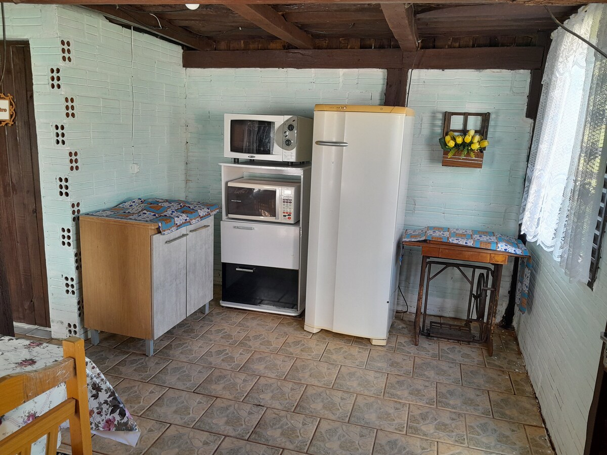 Relax in this peaceful place, surrounded by nature. Listen to the birds singing and the sound of the waters of the Lajeado Minas River. The cabin is surrounded by native vegetation, with access to the river and has hiking trails. The cabin's kitchen is complete with utensils, an electric oven, microwave and minibar. The living room has a sofa bed, whirlpool bathtub and TV with access to Netflix. There is an outdoor deck overlooking the vegetation and sunrise. Outside, there is a wood-burning fireplace and a kiosk with a barbecue grill.