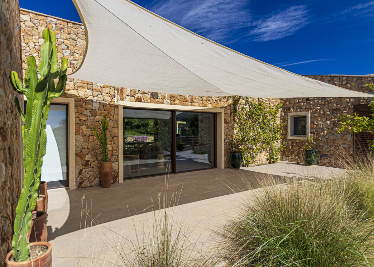 Villa in pietra con particolari rifiniture architettoniche immersa in un bosco di castagni. Un grande giardino, in parte pavimentato a pietra, correda la proprietà dal quale si può ammirare un panorama meraviglioso della maremma toscana. Immersi nella natura si nota da una parte il mare con il golfo di Follonica, l'isola d'Elba e la Corsica, dall'altra l'isola del Giglio. E' possibile fare lunghe passeggiate nella natura o raggiungere località balneari o città d'arte.