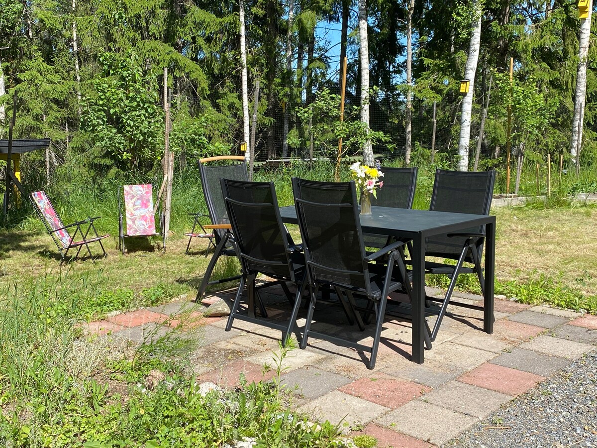 Only 17km from Stockholm city you will find a cozy cabin with private garden, near lake and hiking trails. Relax and explore the nature. Tyresta National Park is just a 15-min drive away. Hiking trails right outside the door. Features Wi-Fi, full kitchen, large bed, and grill area with both charcoal and firewood options. Free seasonal bike rentals make it easy to reach nearby shops (11 min by bike) or the Gudö å with canoe rentals. A pleasant 20 min walk to the bus stop.
