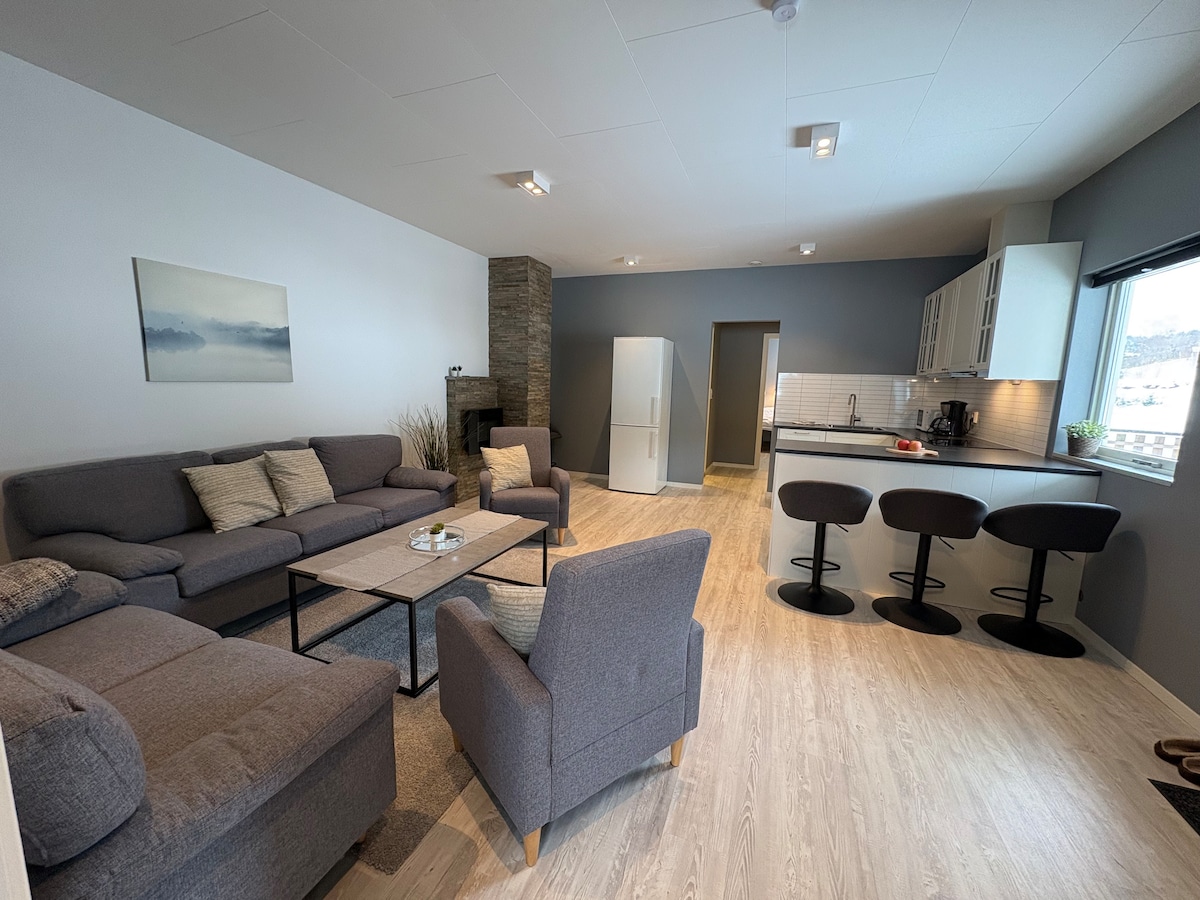 Stylish apartment with a view. The apartment is 70 square. Includes spacious hallway, living room and kitchen in one. Food stall, laundry room and spacious bathroom. 5 minutes drive to Amanda center and Raglamyr. 12 minutes by car to Haugesund city center. Good bus connections close to the apartment.