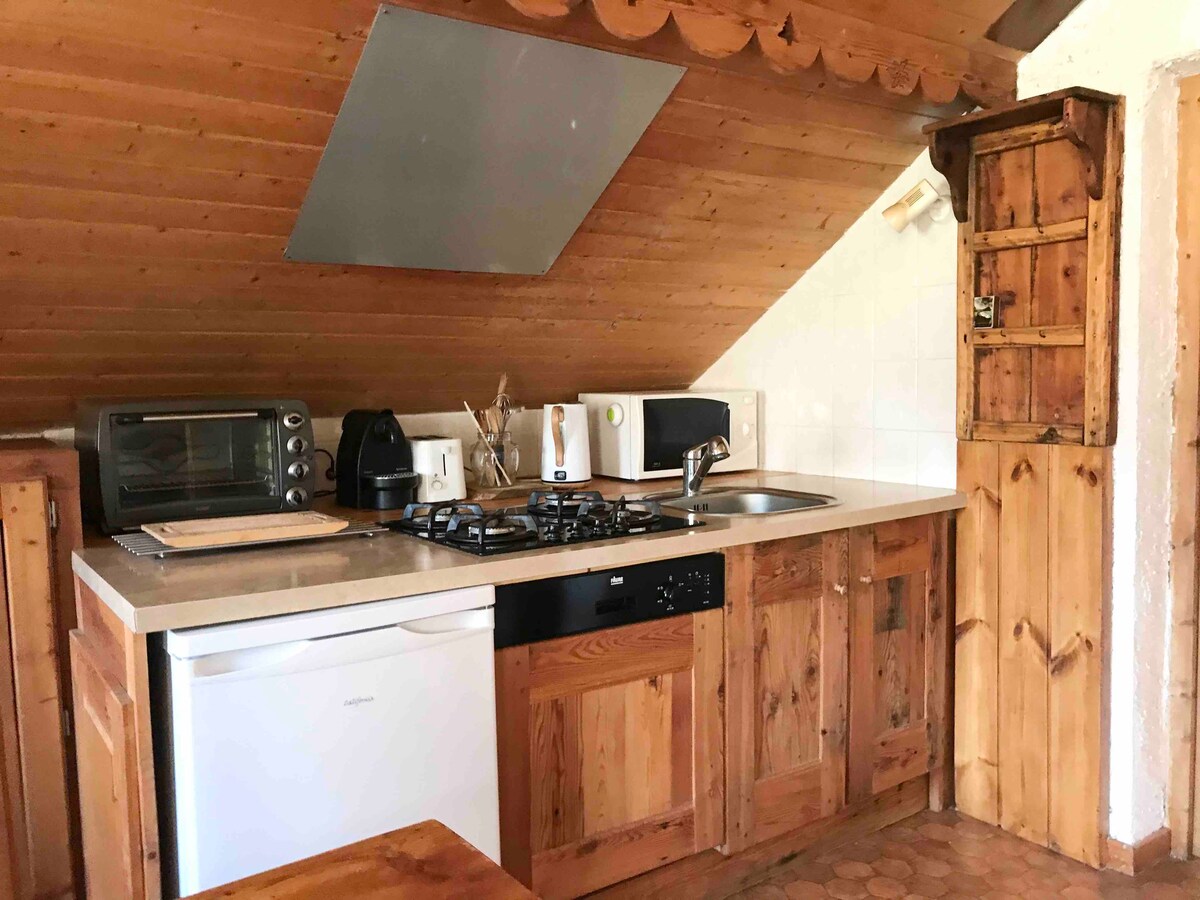 In a chalet, a brand new cozy accommodation, accessible on foot by a small path. Very quiet, private terrace and garden, south/west facing, exceptional panoramic view of the valley. Leisure center and village center 600 m walk, Public parking. 1 master bedroom, a sofa bed for 1 child in the main room, TV, Wi-Fi, bathroom/toilet. Kitchen: stove, oven, microwave, fridge/freezer, raclette grill, blender, kettle, coffee machine.