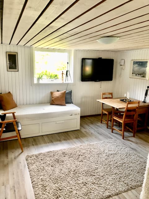 Bo mitt i hjärtat av Ljungskiles mysiga by! Vår stuga är en historisk byggnad sedan 1908. Från övervåningen ser du havet. Perfekt för dig som är på resande fot och vill göra ett stopp, direkt vid tågstation och buss. Du kanske vänner i Ljungskile och behöver eget boende under vistelsen. Den ligger vackert inramad av en äppelträdgård. Du är nära hav, golf, tennis & friluftsliv. På 50 minuter är du i Göteborgs centrum. Perfekt för dig som behöver ett bekvämt boende med arbetsplats! Välkommen