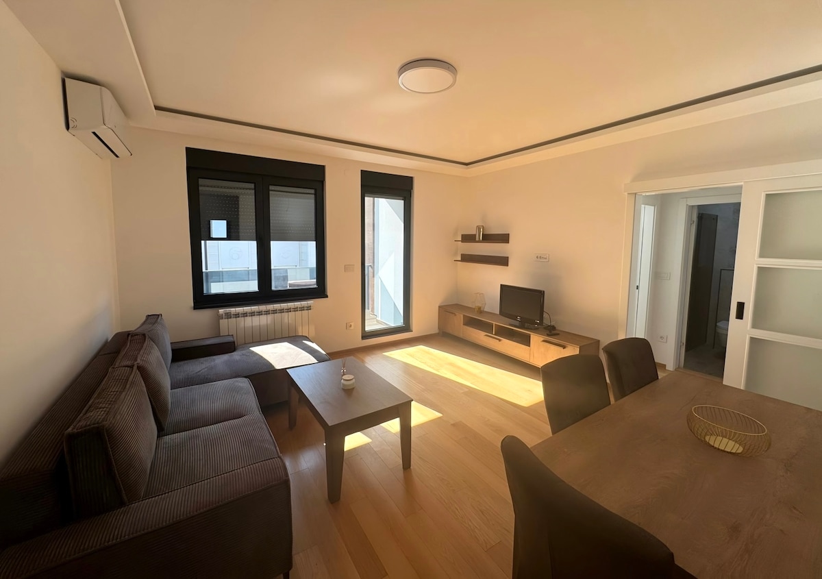 Modern, fully renovated apartment in New Belgrade; just a short walk from Sava Centar and Belgrade Arena. Located on the 1st floor in a quiet residential area with easy access to the highway and city center. Enjoy self-check-in, a comfy king-size bed, a fully equipped kitchen and bathroom, fast free WiFi, and a UHD Smart TV. Designed for comfort and convenience. Late checkout is available for an additional fee, depending on availability.