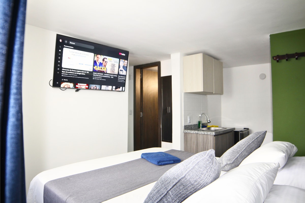 Located in the best area of Bogotá. ideal for business trips, leisure and small families that want to stay in a studio apartment. You will be in walking distance from three main shopping centers, top restaurants, gyms, supermarkets, bars, clubs, parks, coffe shops, hospitals and public trasnport stations in the city. This brand new studio apartament offers 24/7 doorman security a panoramic terrace on the building´s top floor, jacuzzi and front view to one of Bogota´s principal parks, el Virrey