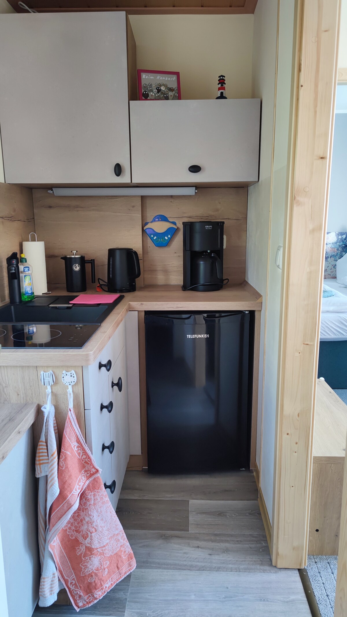 At 28 m², it offers space for 2 people. The living room has a sofa and flat screen TV. The kitchen has a fridge, cooker, kettle, toaster and coffee machine. There is one bedroom. The shower is located in the bedroom. A mirror completes the cute little bathroom. You can enjoy the sunsets from the terrace of the bungalow. A mobile radiator is available for use in the colder months of the year. You can use the WiFi and the car park free of charge.