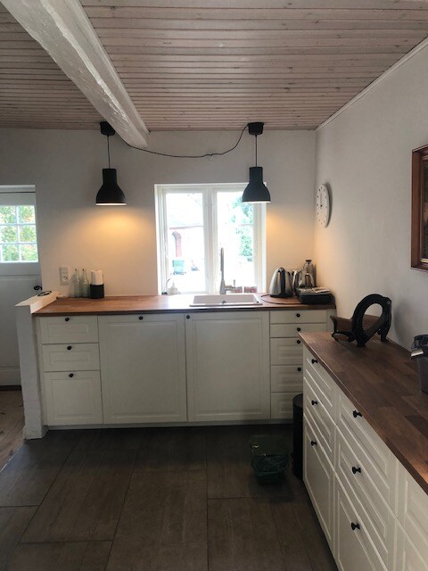 Charming small but functional cottage from 1948 on a cozy plot with several terraces. Really good location. 2 minutes from one of Denmark's best beaches, lots of nature, cycling and hiking opportunities. The house here was newly renovated in 2020-2021 Cozy living room with dining area and open kitchen, the original, with 2 gas burners and fridge. Small bedroom double bed. Annex with toilet and sink and there is a lovely outdoor shower with hot and cold water. In the annex, there's a sleeping area.