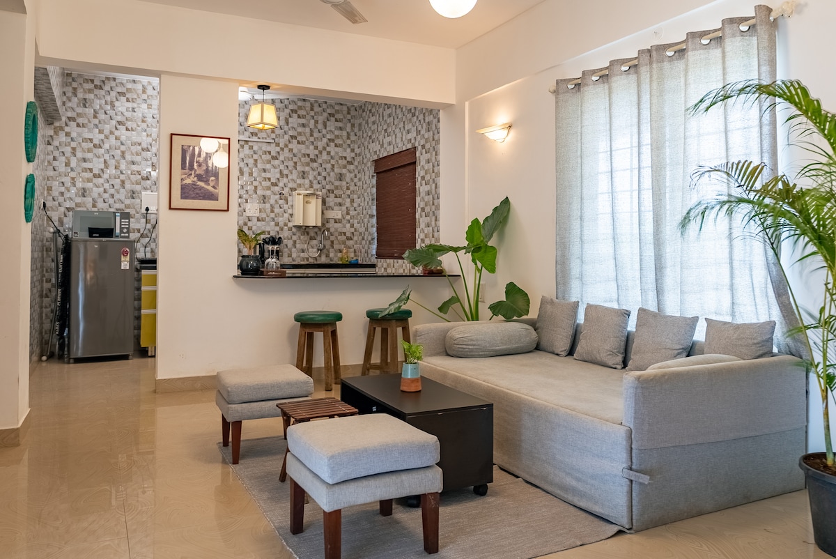 Introducing Pamela Palms™ - home to tall green palms and rare tree-top views, this bright, modern 67m² 2-bedroom apartment on the 3rd floor is a 5-min drive from Anjuna beach, and is full of natural light & Goa feels! Equipped with super fast Wifi (300 Mbps) and power backup, you'll be closely connected to the coolest eateries, classy restaurants and supermarkets. A lively stay for your Goa getaways and workation with your group!