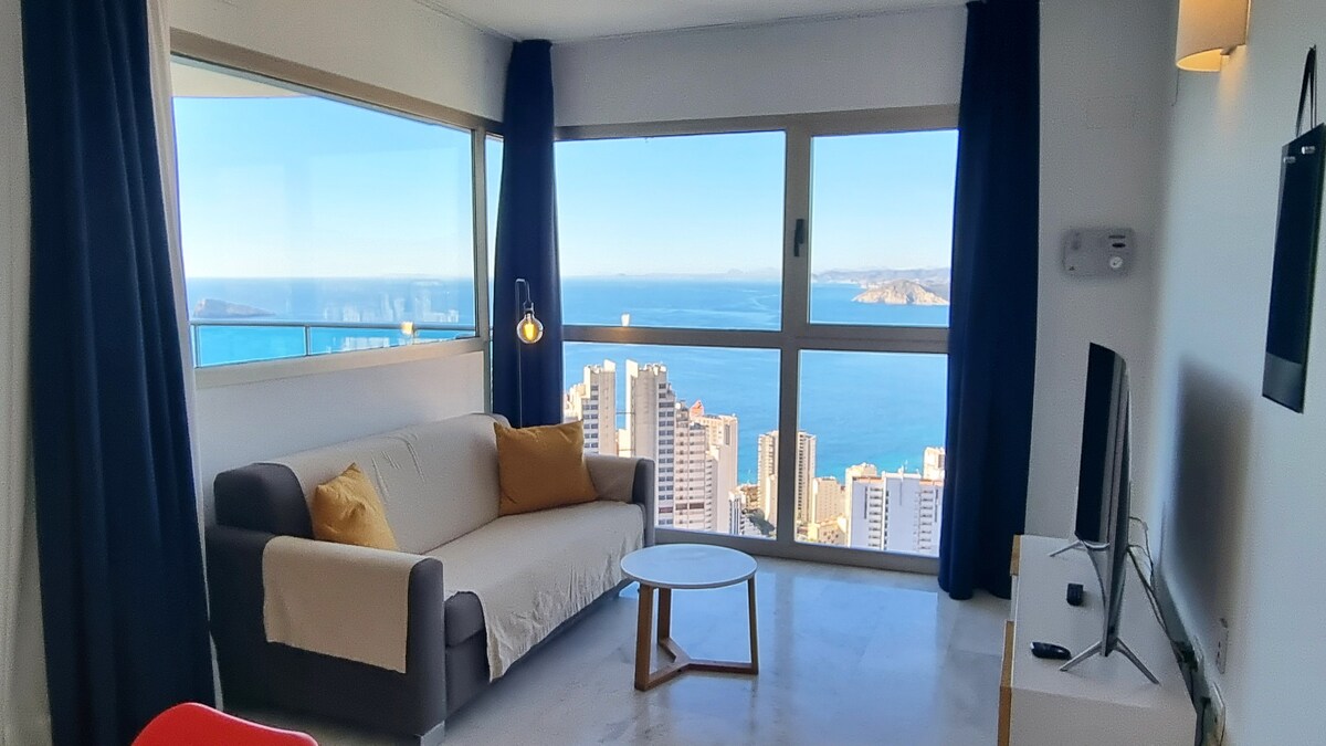 Amazing one-bedroom apartment on the 36th floor of Torre Lugano, one of the highest buildings in Europe. The one bedroom apartment is located in a private urbanization, with swimming pools, gym, tennis and paddle courts, green areas and children's area. This apartment has stunning views of the sea and the city of Benidorm from the 36th floor, with a large terrace to enjoy the sun and the views.