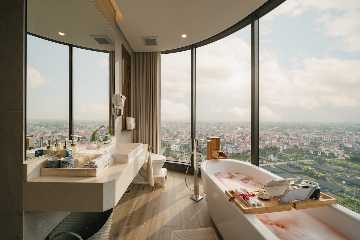 A high-floor garden apartment on the 24th floor, designed for guests who value privacy and quiet luxury. Featuring a rare private garden with open views of Ecopark’s island villas. Calm, elegant, and refined — ideal for couples, creatives, and discerning travelers seeking a boutique living experience rather than mass tourism. ~~~~~ Căn hộ tầng 24 có sân vườn riêng hiếm có, view biệt thự đảo Ecopark. Không gian yên tĩnh, tinh tế, dành cho khách có gu và trân trọng trải nghiệm sống cao cấp.