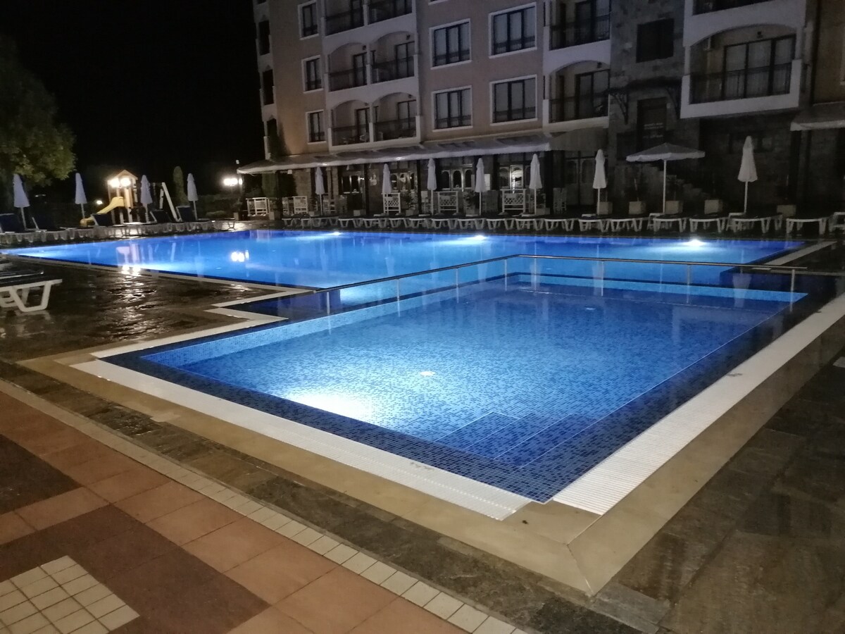 Hello…🙂 Take a look at our offer for a wonderful holiday. Welcome to the Golden Sands Resort in the Amphora Palace Hotel. I offer a furnished, huge studio in a closed complex. Equipped with a kitchenette. WI-FI, air conditioning, a large swimming pool with a children's section, fitness, green areas, 24-hour security, free parking around and in the complex. 500m from the beach, and 400m from the center. ☀️☀️🏝☀️☀️