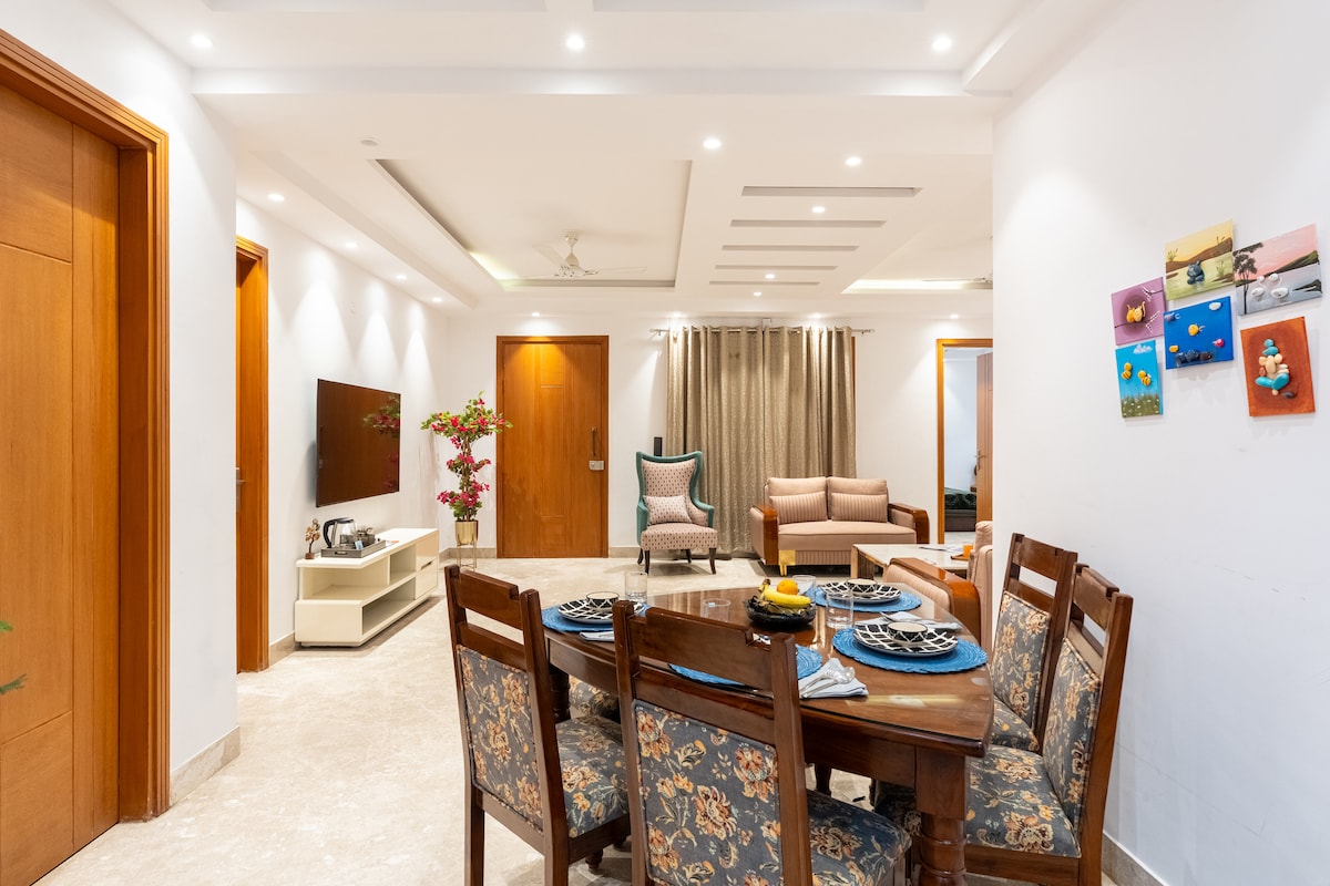 Stay at our spacious 2BR Park-View Retreat, 8.5 km from airports & 15 min ride to the metro. Enjoy airy balconies, park views, mahogany/wooden beds, a fully-equipped kitchen, high-speed Wi-Fi, Smart TV, complimentary toiletries, & local recommendations. Relish home-cooked meals, explore nearby market & malls, and unwind with serene jogging paths. Experience top-notch hospitality with flexible check-in/out, laundry services & optional airport transfers. Book now for a memorable Delhi stay!