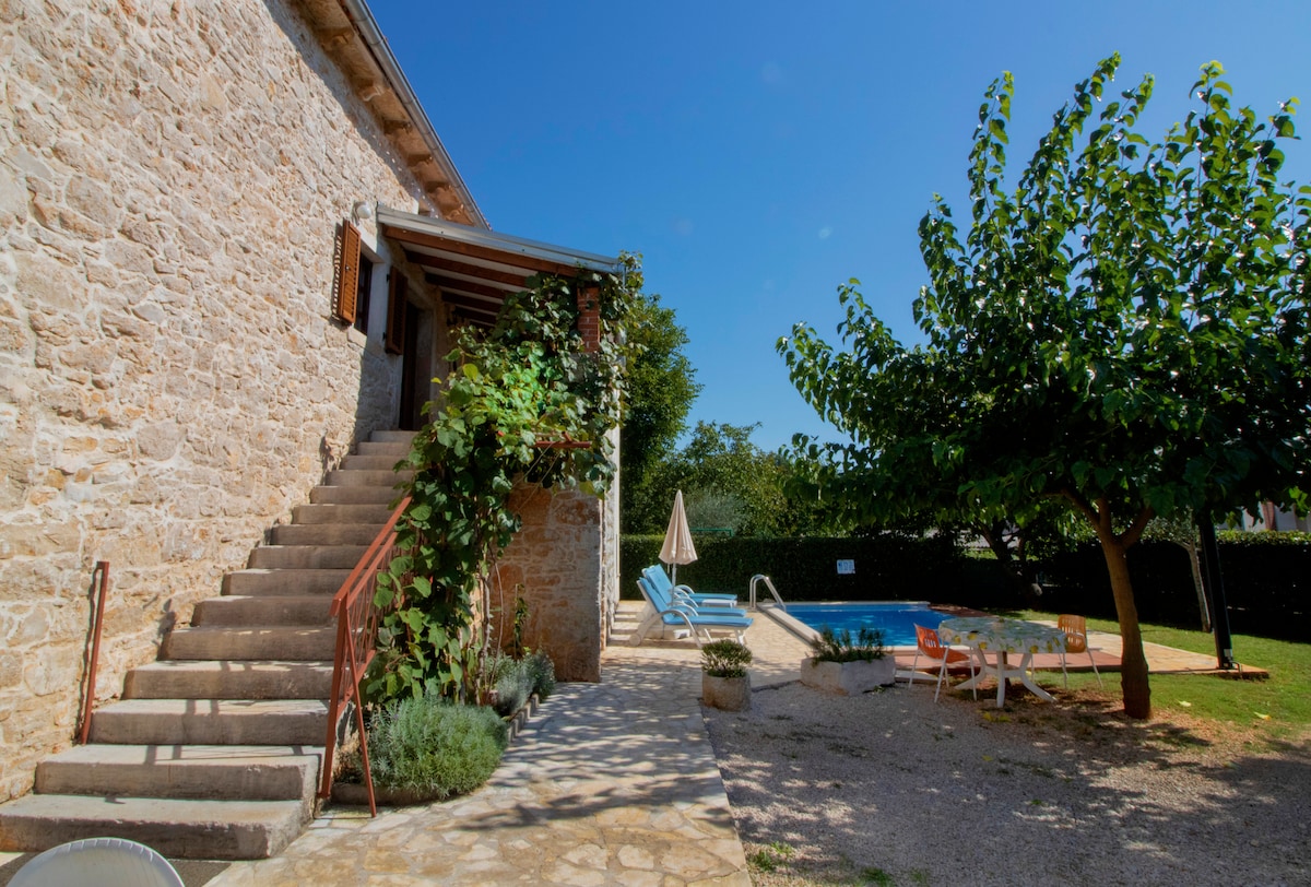 Welcome to western Istria, to authentic detached stone house from 1850s. Only 20 min ride to the beach and Poreč with UNESCO heritage. Hilltop Motovun is 10 min ride away, Višnjan, with a supermarket, 5 min away. Enjoy your own 2-bedroom house with fully fenced yard, 2 ACs, swimming pool, trampoline, BBQ, free parking, and outdoor dining. We respect your privacy and enjoy sharing hospitality, if you like. Possible to buy wine and olive oil in the village or borrow bikes. One pet is free!