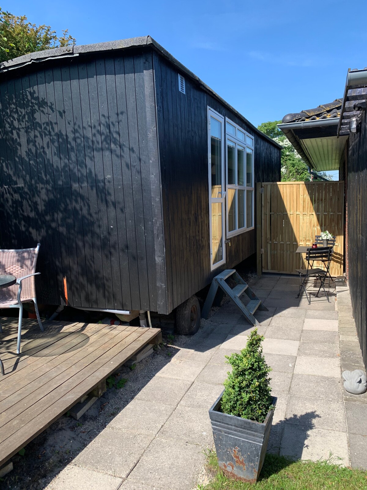 This charming bright 14 m2 shed is undisturbed in a corner of our garden, right next to our house. You have peace and quiet and have your own private entrance. Enjoy the sun or lunch in the garden furniture on the large wooden terrace in front of the trailer.