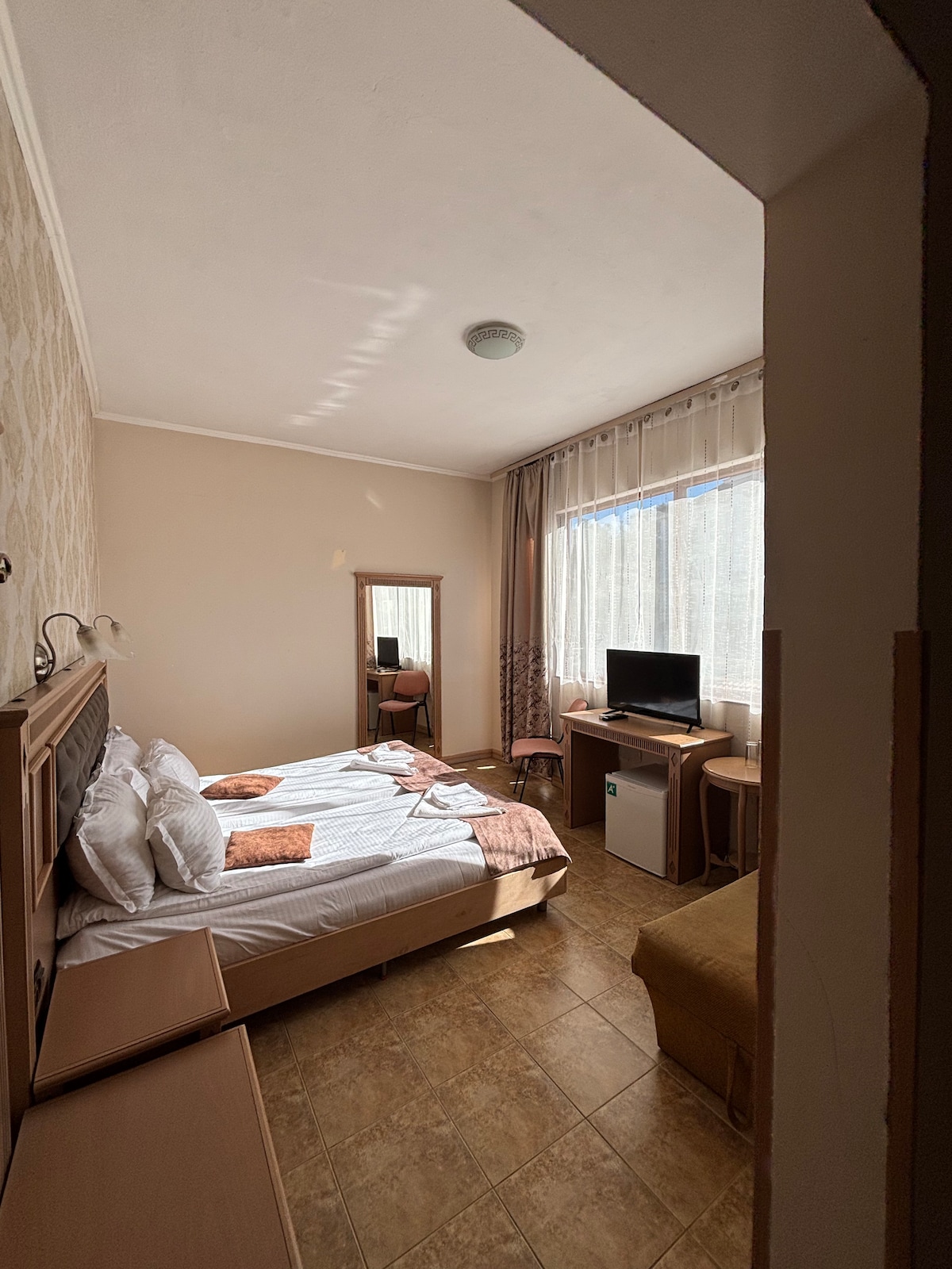 Villa “Nadezhda” offers everything required for a private luxury family holiday. The villa has a bedroom with a king size bed, open plan kitchen, dinning area, a living room with two sofa beds and large terrace with garden furniture. The villa has gas central heating and wood burning fireplace. Our guests have an outdoor swimming pool, jacuzzi and sauna for private use and can also use an outdoor kitchen supplied with charcoal BBQ and electric grill. Dedicated office space at extra cost.
