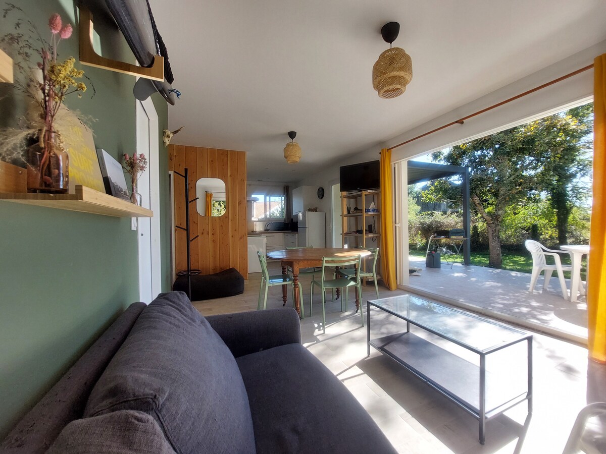 Independent accommodation of the main house located 10 minutes walk from the beaches and the center of Montalivet les Bains. Enjoy a private space including: - 1 bedroom with a 160 cm bed, - a private living room with sofa and TV, - an independent bathroom equipped with a walk-in shower, double vanity, - independent toilets, - a covered and equipped outdoor kitchen, - access to common outdoor areas: enclosed and landscaped garden, outdoor shower, sunbeds, swimming pool.