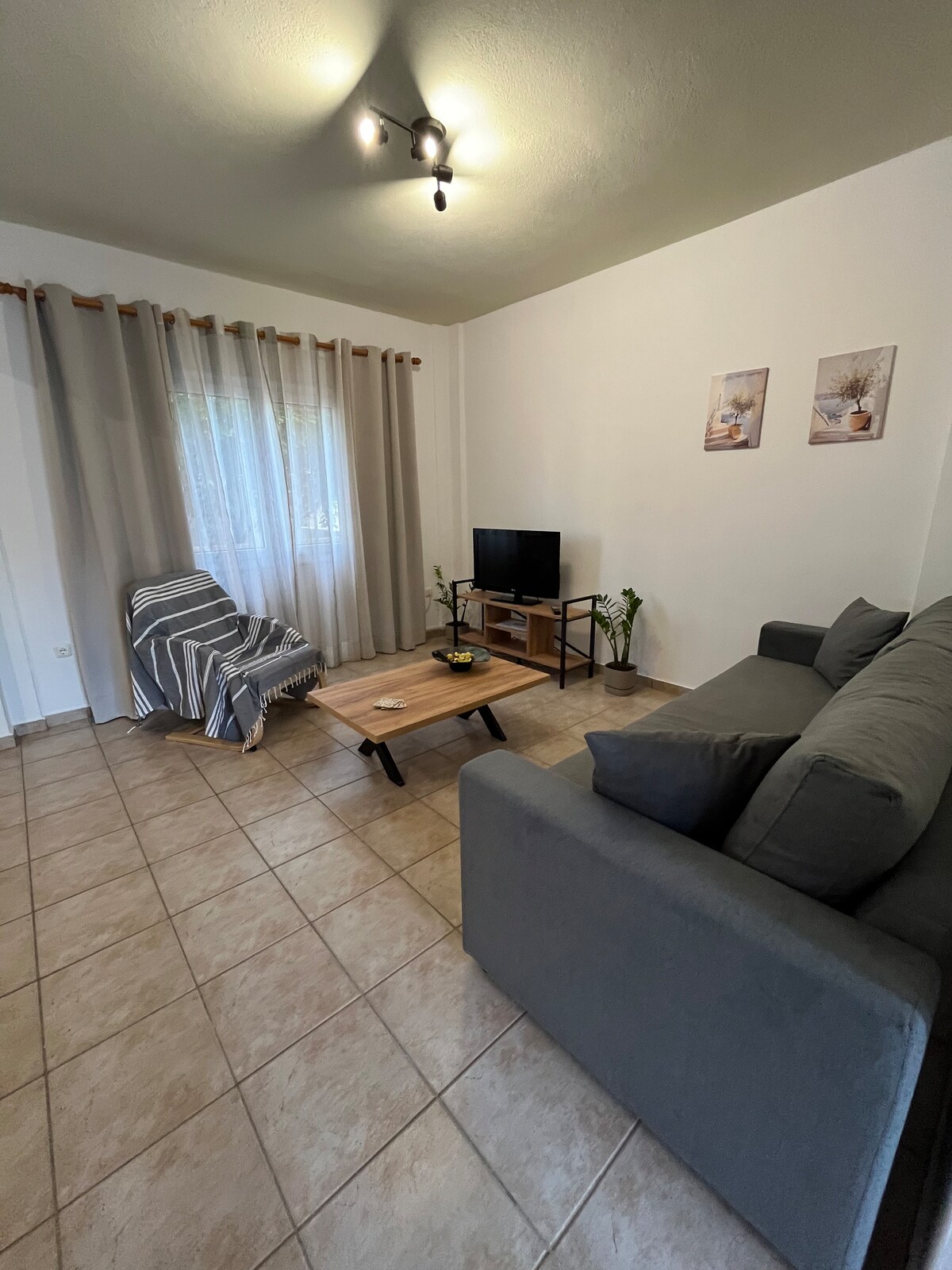 A apartment including 2 bedrooms, a bathroom, and a big living room with a kitchen and a very comftable balcony and courtyard. There is also a free parking. Our house is 10 minutes away from the airoport, 2 minutes away to the supermarket and to the bakery . A 5 minutes walk to Pizza Fun and to Traditional Greek food souvlaki.