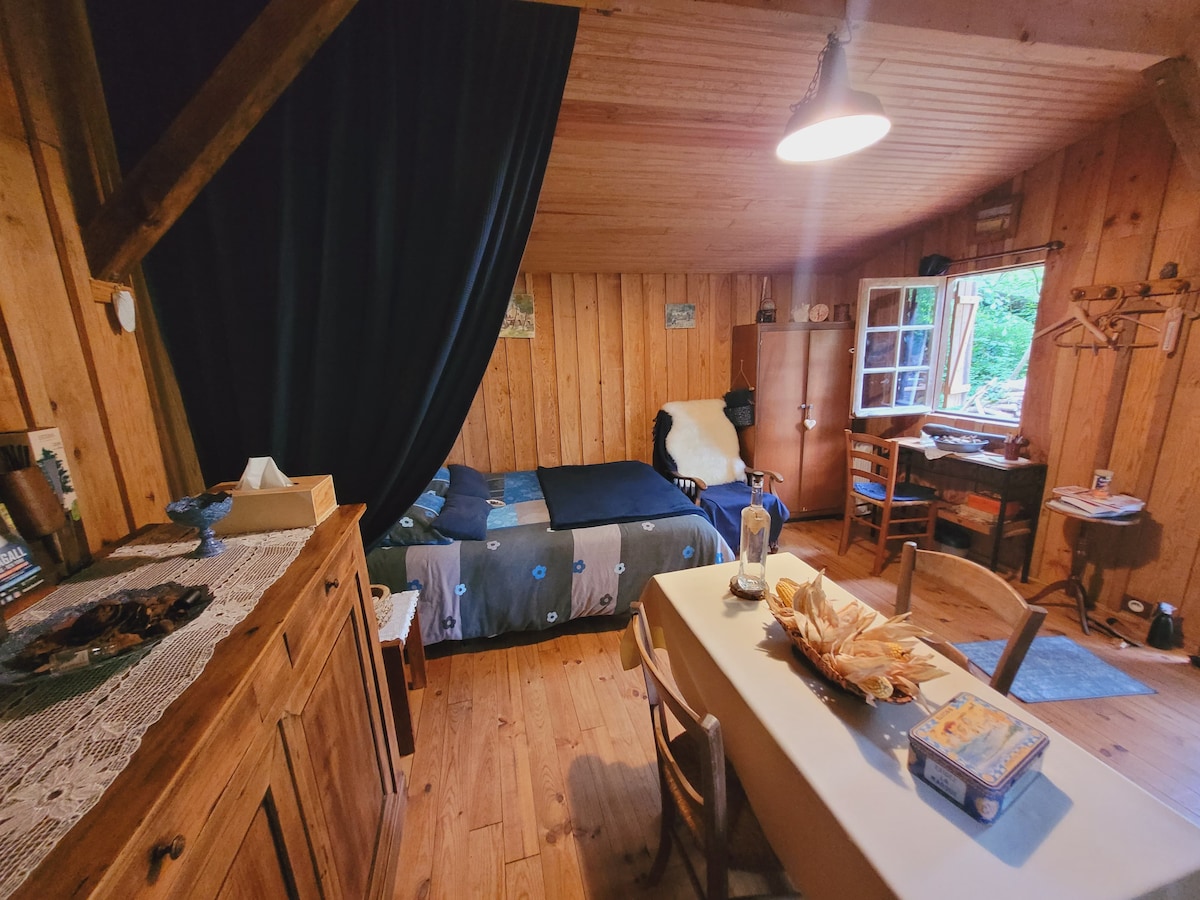 Small rustic chalet on the edge of the forest in a large park 50 m from our house. A simple place surrounded by trees and lulled by birdsong. Relax in this unique and quiet accommodation. Perfect for reconnecting with nature and yourself. Equipped with the essentials for a peaceful and natural stay. The accommodation is composed of a room (studio) with integrated kitchenette and storage. The bathroom with shower, sink and dry toilet is adjoining (entrance from the outside)