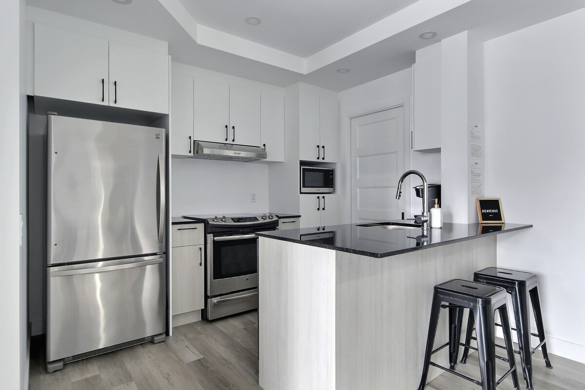 This modern condo (2022) is less than a 15-minute walk from Old Quebec. Enjoy the amenities of a hotel without neglecting the comfort of your home. It includes nearby parking, a swimming pool, a terrace, a gym, a fully equipped kitchen, and a washer and dryer. Its cozy bed will welcome you after your days of walking to visit the most popular tourist attractions or after your evenings at the many quality restaurants nearby.