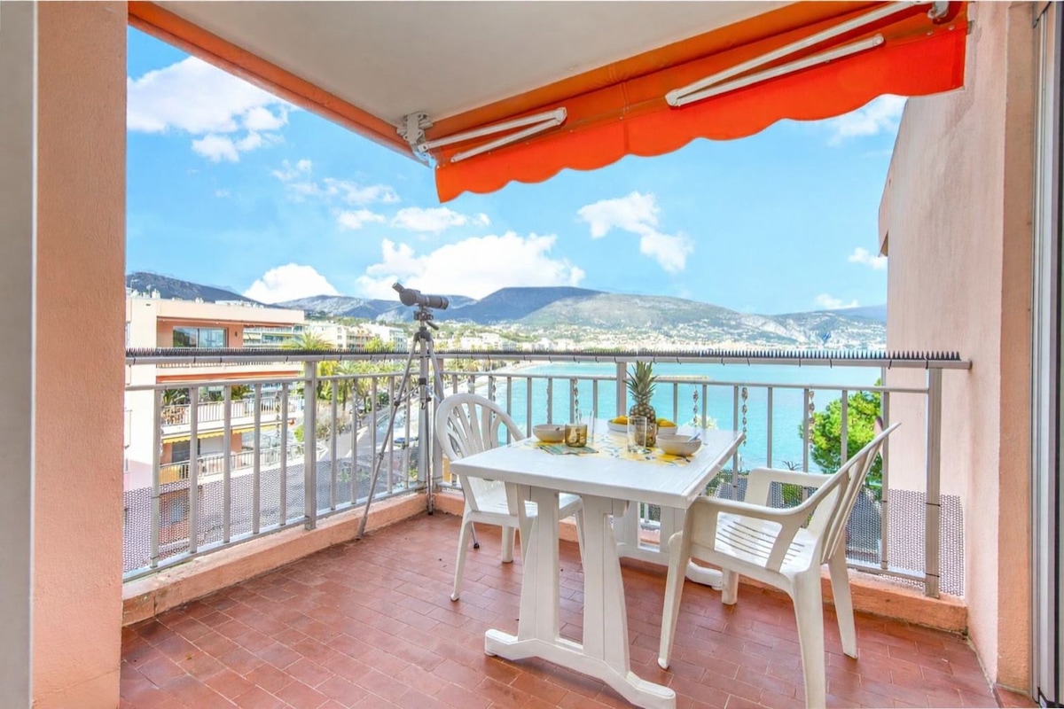 "SEAVIEWS BY JENNI MENTON" presents: Beautiful NEW 2-Room Seafront, on the Promenade du Soleil. 50 m2 of design, large 18 m2 terrace, sea view as if on a boat from the entire apartment. Designed for the comfort of 4 people. Highly sought-after decoration, high-end materials and amenities. CLOSED GARAGE* ELEVATOR AIR CONDITIONING SMART TV UNLIMITED HIGH-SPEED INTERNET BOSE BLUETOOTH SPEAKER A few minutes' walk to all shops and activities. Bus at the bottom of the residence, train station within walking distance.