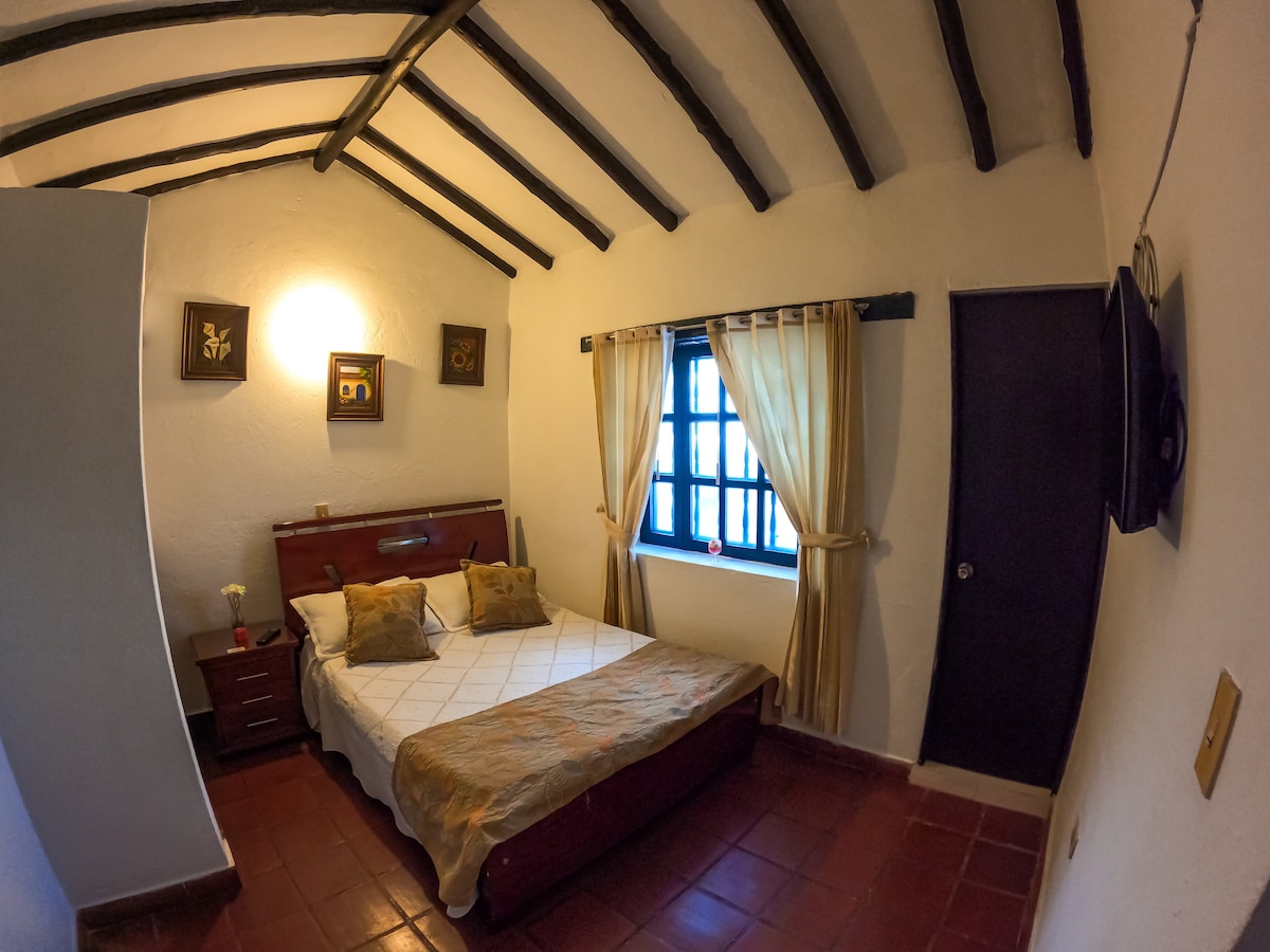 This nice room is located in Casa Pancha Mama with an excellent location just two blocks from the main square. It is ideal for a couple to spend a few romantic days exploring the charming Villa de Leyva. It is spacious and cozy, equipped with a double bed and a full bathroom. The room has a beautiful view of the house's courtyard and the mountains. A delicious breakfast is included in the room rate.