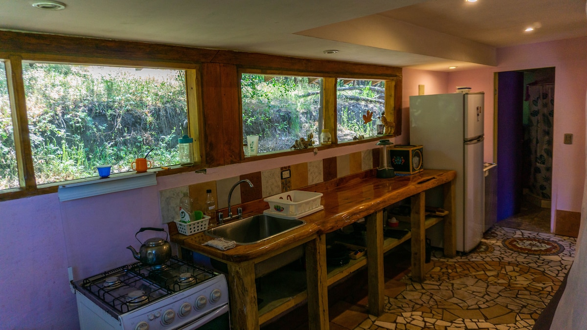 Casa Jardin Adesmia is a very bright space, with beautiful views of the garden and the house's orchard. It has a large bedroom and a living room with a dining room and kitchen, which have a beautiful view of the sky and mountains. It also has a bathroom and a washing machine. The living room, dining room, and kitchen are spacious and bright, very comfortable to enjoy every day. On warm days you can enjoy the green area of the house, and tour the hosts' orchards in times of productivity.